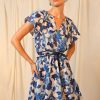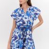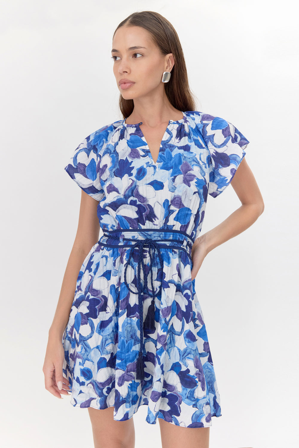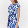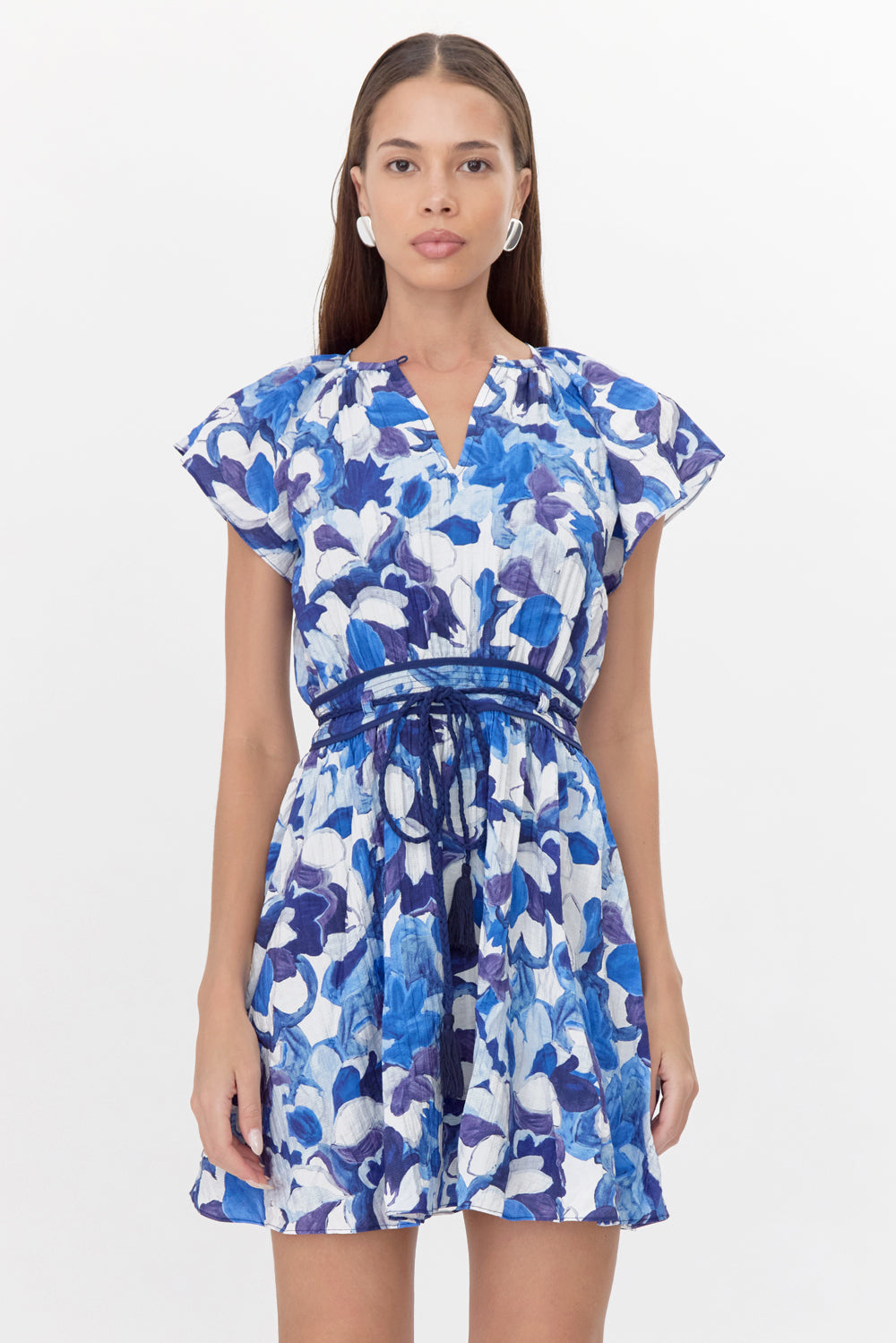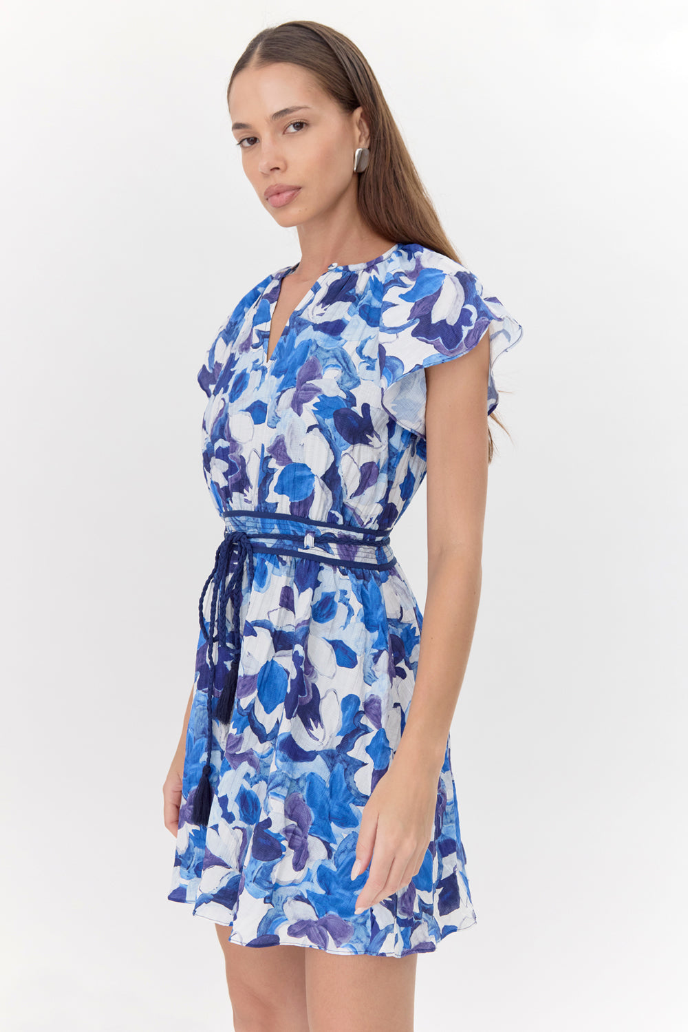 The “Aeila Dress” is defined by it’s floral print and relaxed silhouette. The design features a braided waist belt with tassels and a notched neckline with a button closure. The mini dress is finished with flutter sleeves and a contrasting waist band.