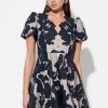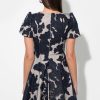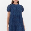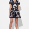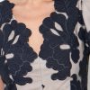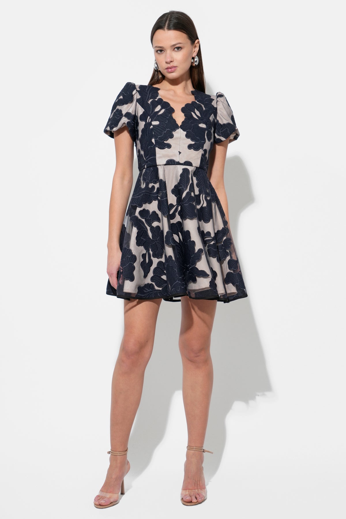 It features a nude-colored base fabric layered with a delicate, sheer navy mesh overlay that is adorned with a beautiful, all-over floral embroidery pattern. The dress has a flattering mini length and a defined A-line silhouette.