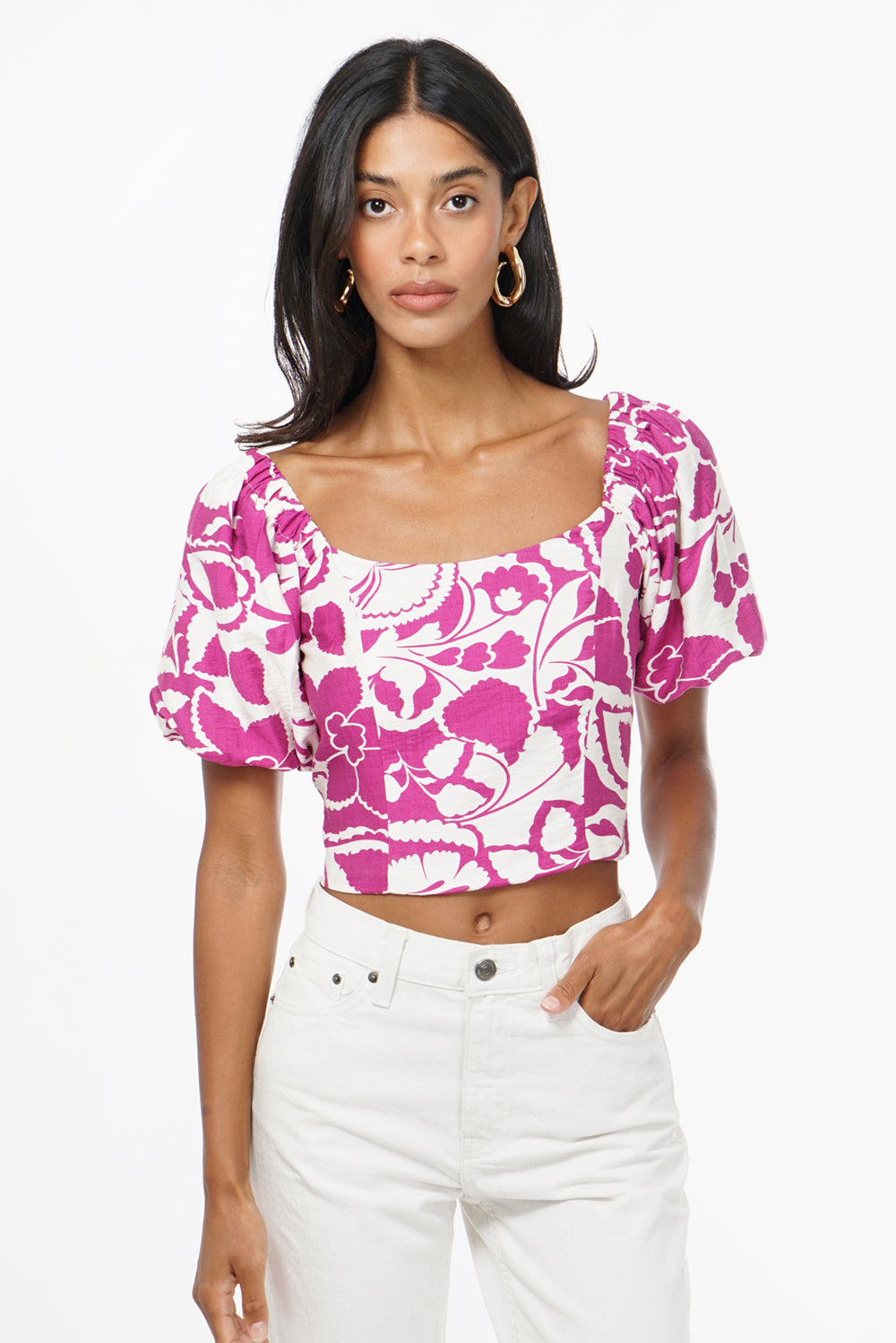 Your new favorite statement top just entered the chat. The Anissa features bold floral print, puff sleeves, and a flattering wide neckline. The cropped length pairs perfectly with high-waisted denim or mid-rise pants for a fun and flirty look.
