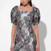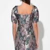 This charming mini dress, in a delicate grey hue, features a beautiful textured jacquard fabric that catches the light. The design includes a modern square neckline, feminine puff sleeves, and a fitted bodice that flows into a tiered, flounced skirt.