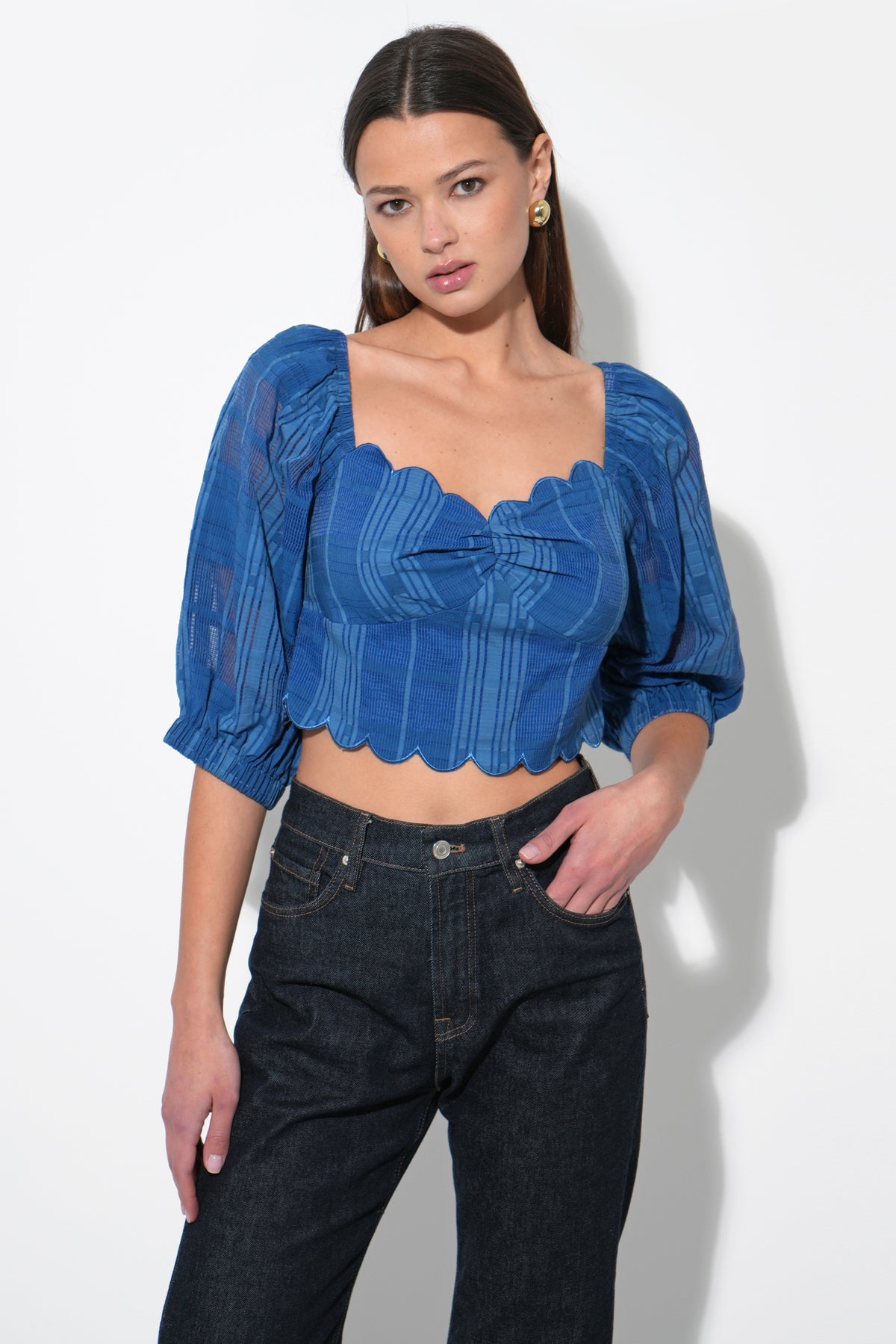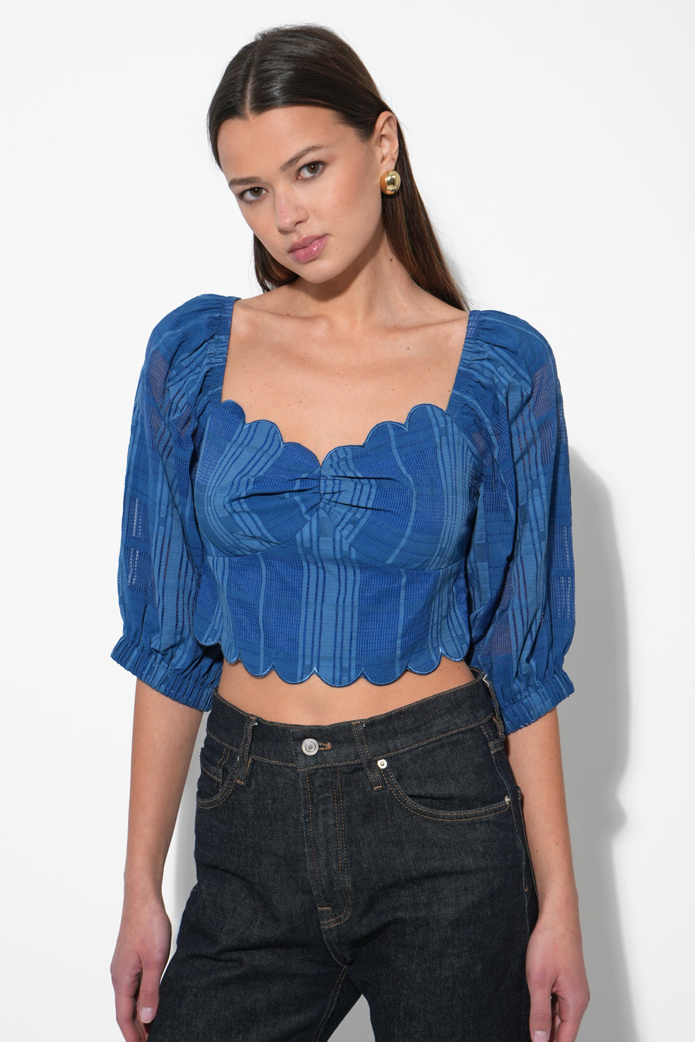 This elegant sleeveless top, in a crisp light hue, features a sophisticated jacquard stripe pattern that adds subtle depth and dimension. It is beautifully designed with a chic mock neck and a distinctive scalloped hemline, offering a unique and feminine finish.