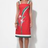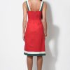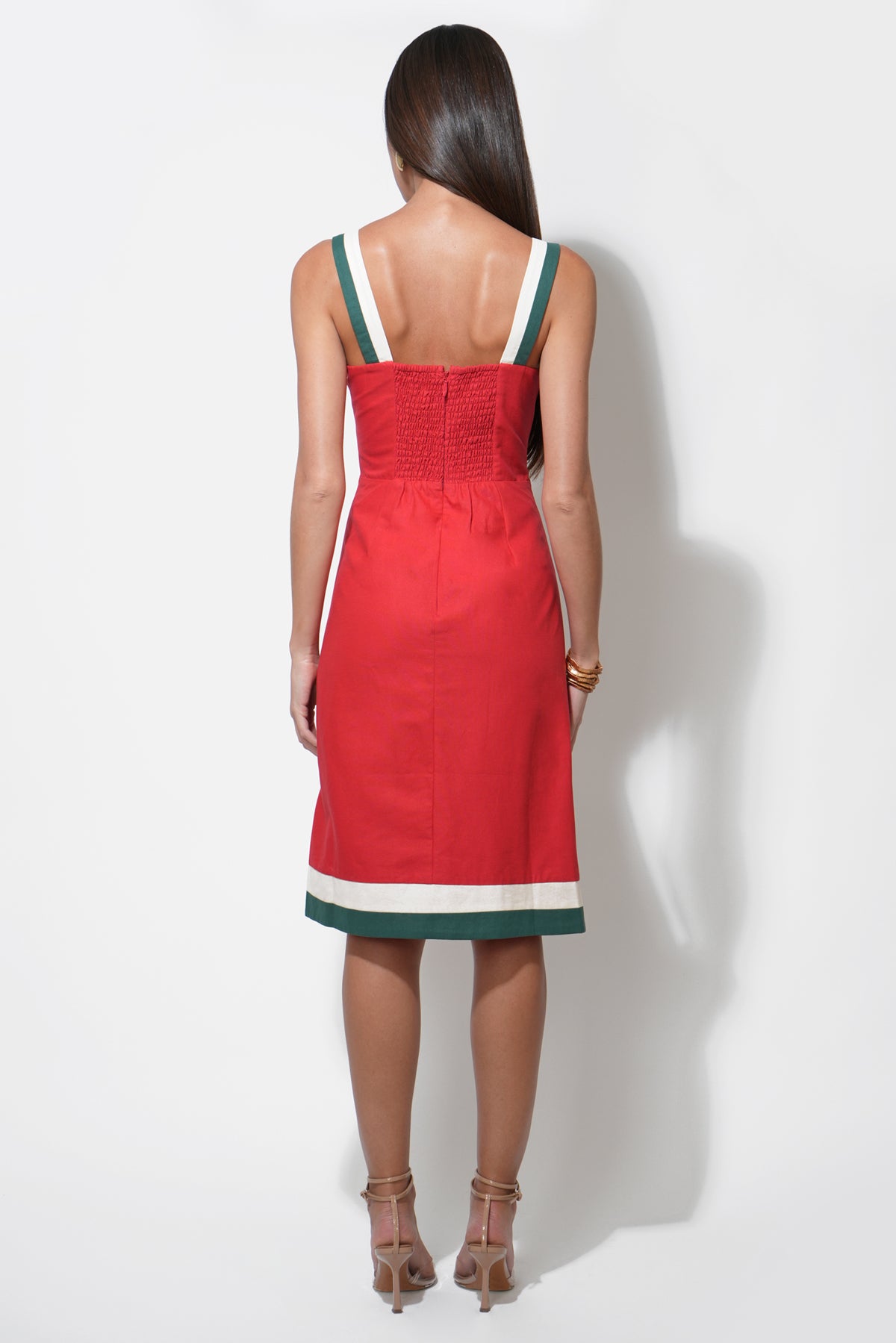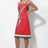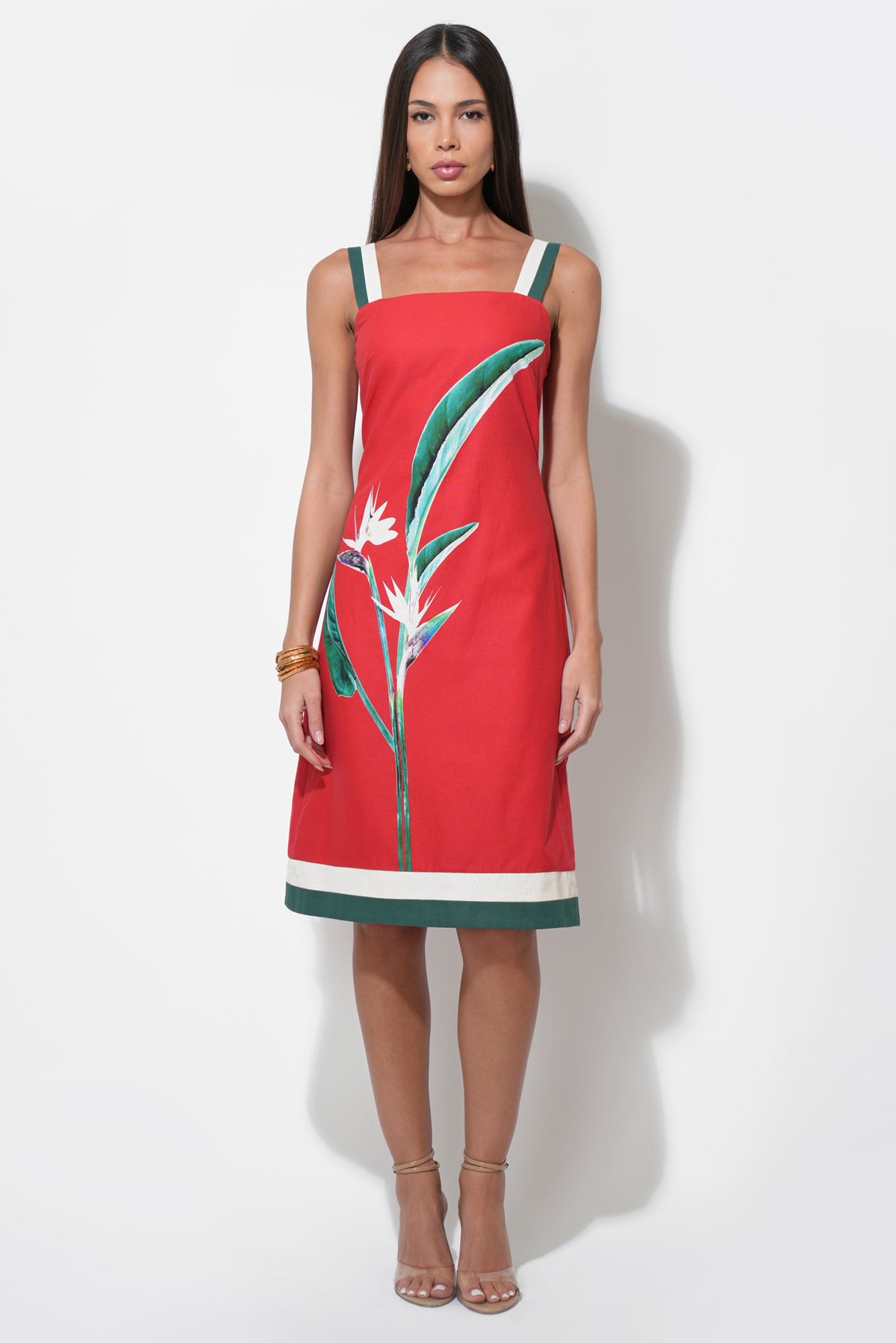 This piece captures the essence of a tropical escape with its bold, burnt red fabric beautifully showcasing a striking “Bird of Paradise” floral print. The dress features modern, contrasting wide straps in white with a hint of forest green, echoing the chic trim at the hem. Designed with a flattering square neckline and a fitted bodice that subtly flares into a comfortable midi skirt, this dress exudes effortless style.
