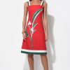 This piece captures the essence of a tropical escape with its bold, burnt red fabric beautifully showcasing a striking “Bird of Paradise” floral print. The dress features modern, contrasting wide straps in white with a hint of forest green, echoing the chic trim at the hem. Designed with a flattering square neckline and a fitted bodice that subtly flares into a comfortable midi skirt, this dress exudes effortless style.