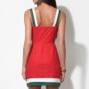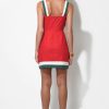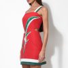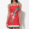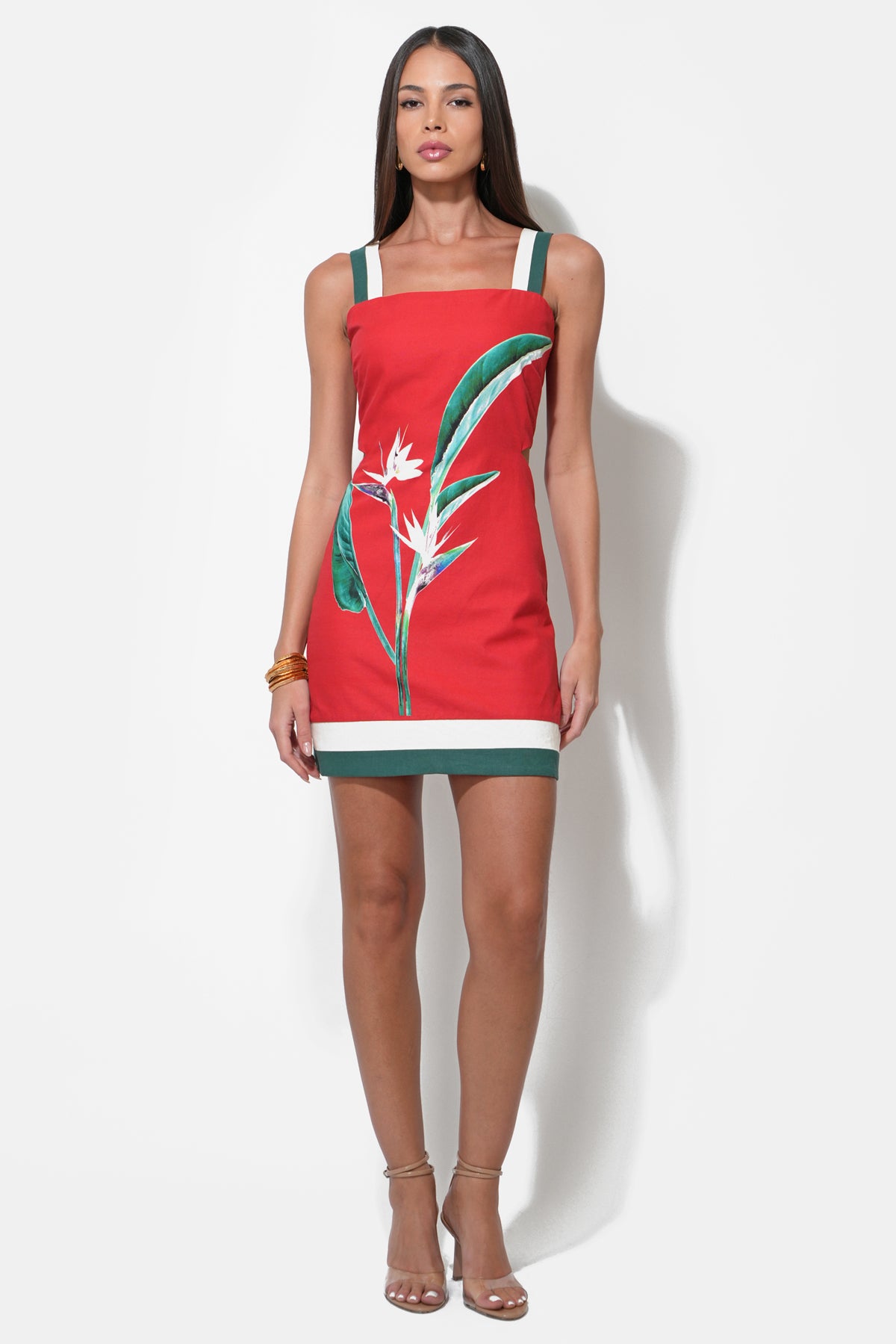 This piece blends vibrant color with daring design, featuring a rich, burnt red hue as its base. Adorned with a striking “Bird of Paradise” floral print on one side, its artistic flourish is undeniable. The dress boasts chic white and forest green wide straps that offer a modern contrast, complementing the matching trim along the hemline.