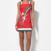 This piece blends vibrant color with daring design, featuring a rich, burnt red hue as its base. Adorned with a striking “Bird of Paradise” floral print on one side, its artistic flourish is undeniable. The dress boasts chic white and forest green wide straps that offer a modern contrast, complementing the matching trim along the hemline.