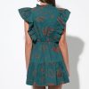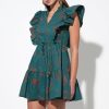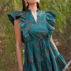 This delightful mini dress, in a beautiful light hue, is adorned with intricate embroidery, adding a touch of artisanal elegance. It features a flattering V-neckline with a delicate tie detail, allowing for adjustable styling, and romantic flutter sleeves that enhance its feminine appeal.