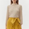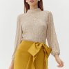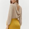 Turtleneck blouse decorated in champagne toned sequins. The back reveals a stunning exposed back with draping.
