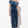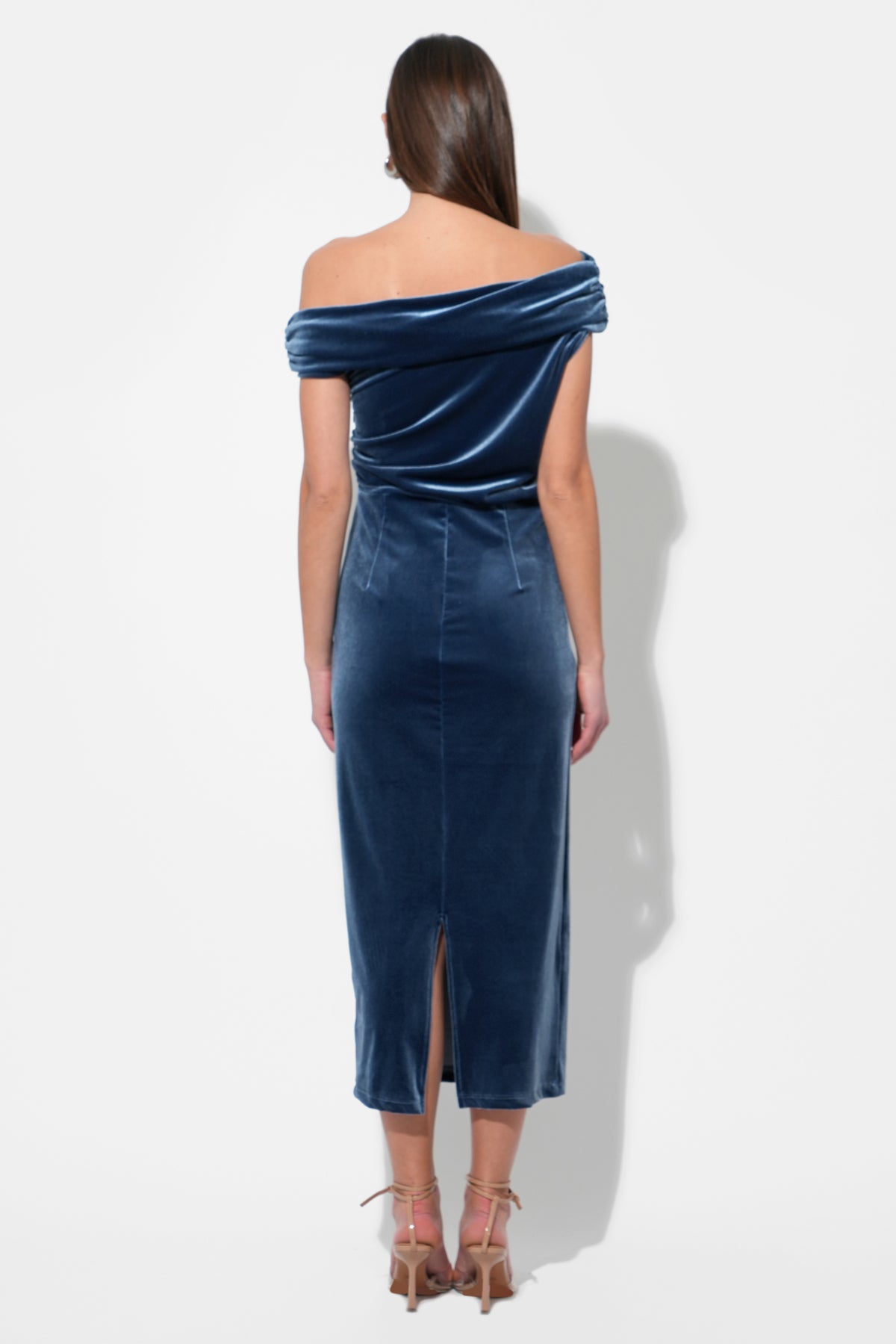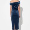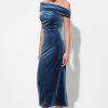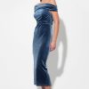 The dress features a flattering off-the-shoulder neckline with a unique, draped and ruched bodice that creates a beautiful, textural detail. The body of the dress has a slim, figure-skimming fit that falls to a midi length.