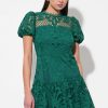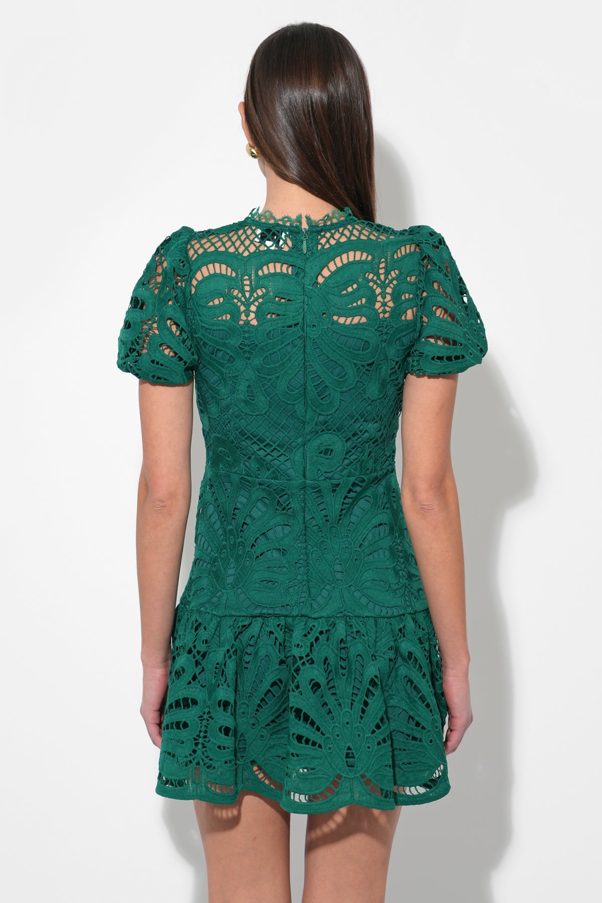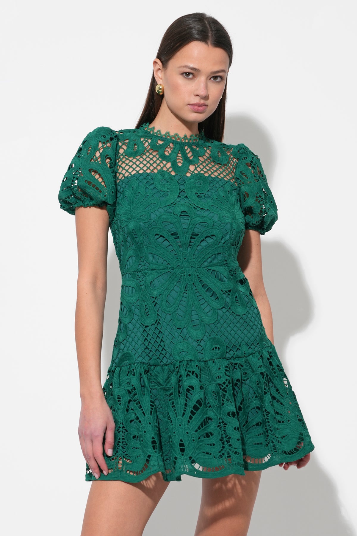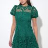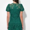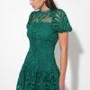 Designed with chic short sleeves and a refined crew neckline, this dress offers a sophisticated yet playful aesthetic. The intricate lace detailing adds depth and texture, making it a standout piece for any special occasion.