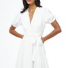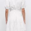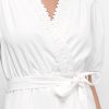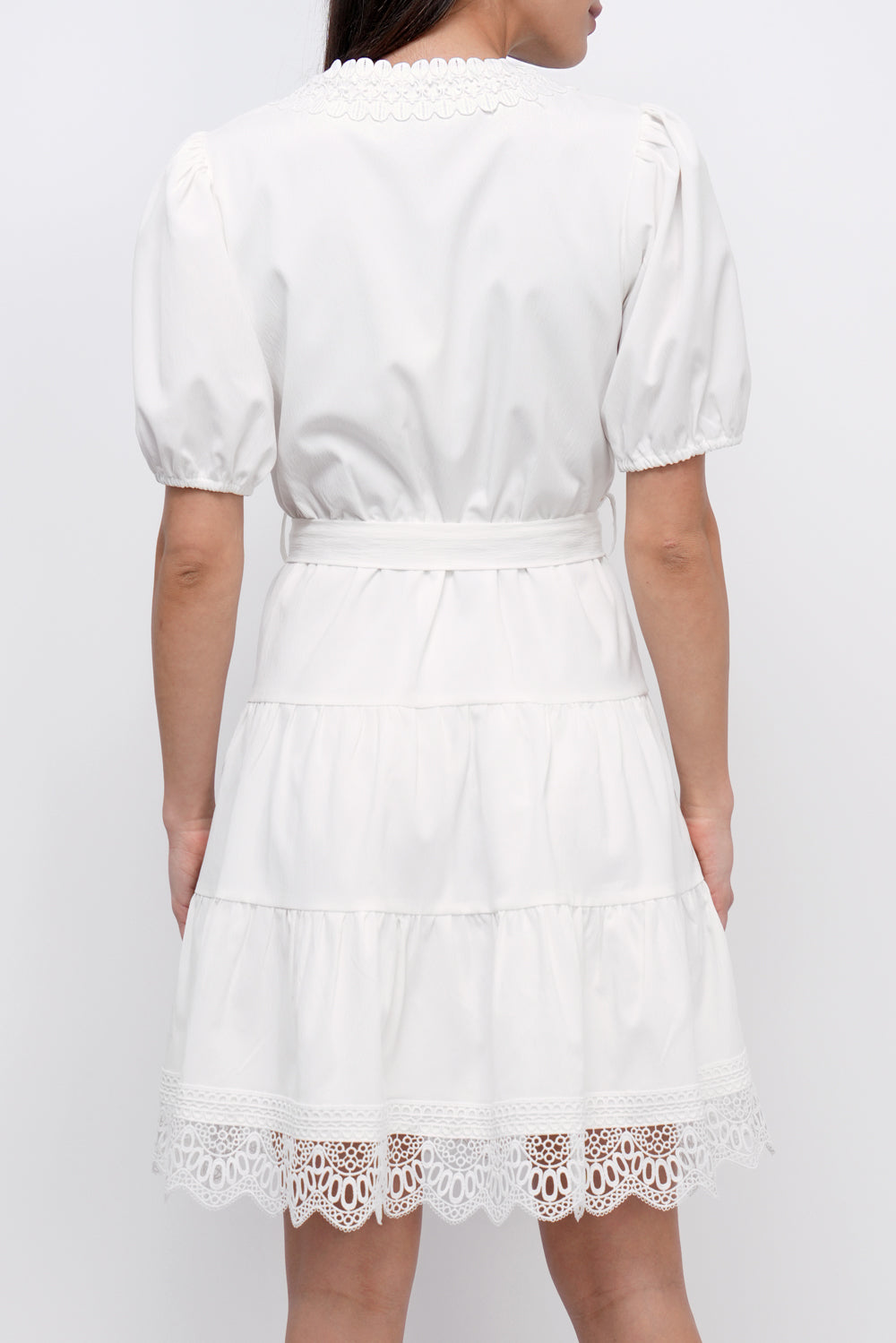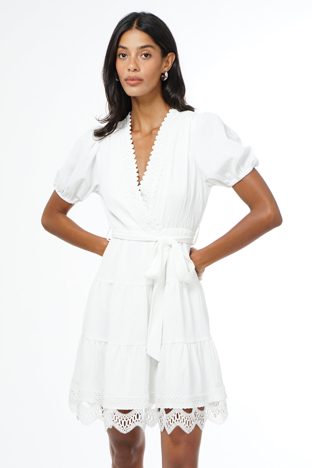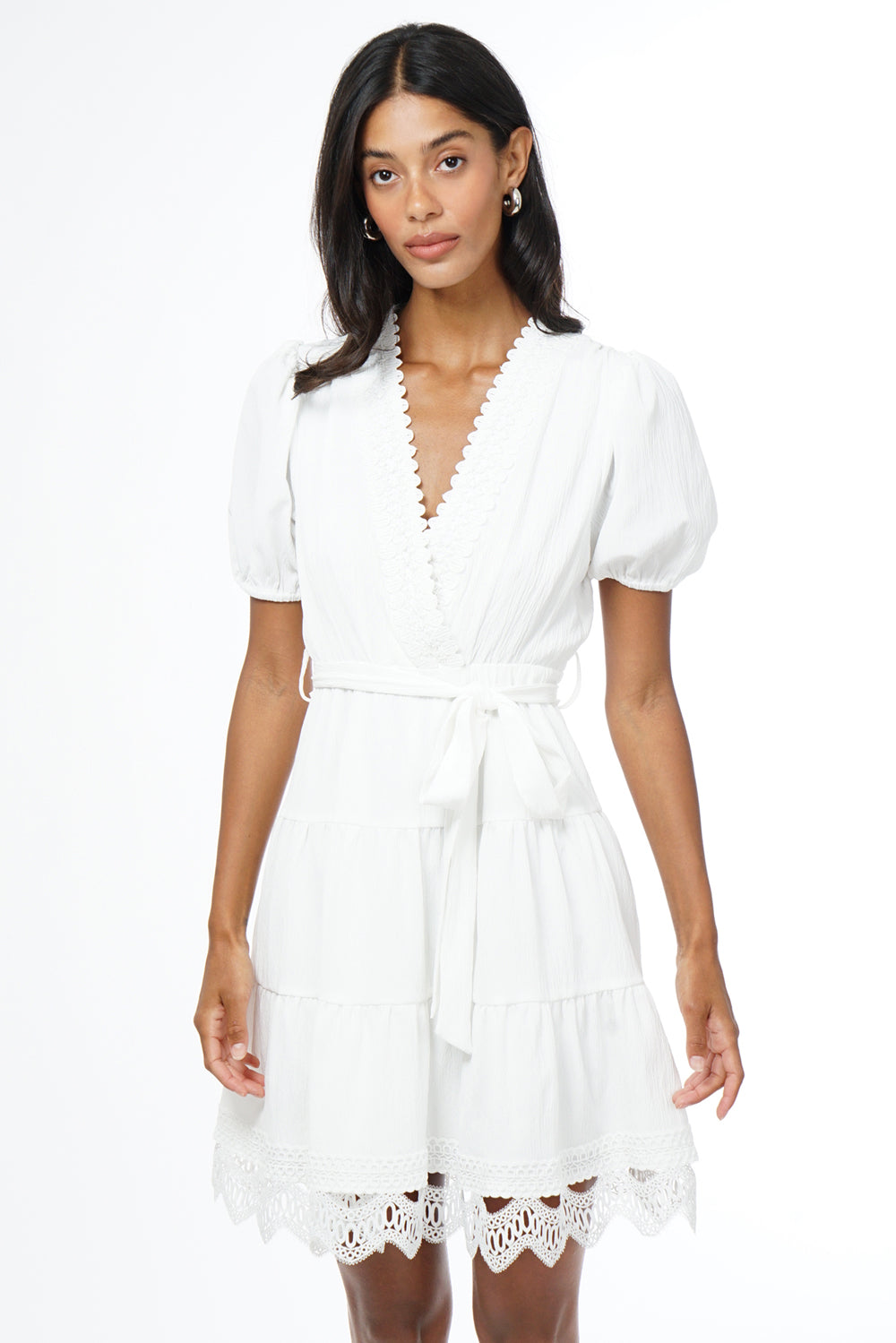 Designed with soft puff sleeves, a scalloped surplice neckline, and a tiered skirt finished with intricate lace trim. The self-tie waist cinches you in for a flattering, feminine silhouette that’s effortlessly chic.