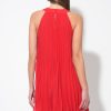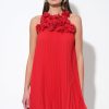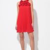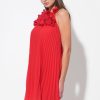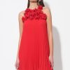 This stunning red mini dress features a unique halter neckline adorned with an array of meticulously crafted 3D floral appliques, creating a beautiful and tactile texture. The dress flows into a flattering pleated A-line silhouette, offering graceful movement and a comfortable fit.