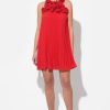 This stunning red mini dress features a unique halter neckline adorned with an array of meticulously crafted 3D floral appliques, creating a beautiful and tactile texture. The dress flows into a flattering pleated A-line silhouette, offering graceful movement and a comfortable fit.