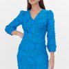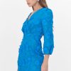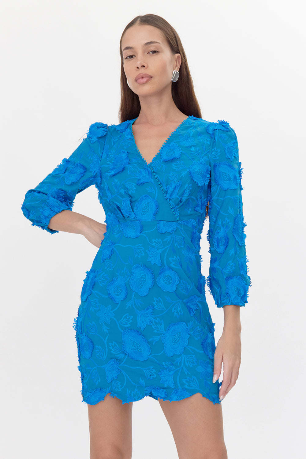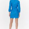 Lace, mini dress featuring a scallop hem and puffed 3/4 sleeves. The dress is finished with a V-neckline and floral design within the lace. It’s rendered in a vibrant blue and is fully lined with a hidden, back zipper.