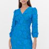 Lace, mini dress featuring a scallop hem and puffed 3/4 sleeves. The dress is finished with a V-neckline and floral design within the lace. It’s rendered in a vibrant blue and is fully lined with a hidden, back zipper.