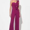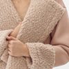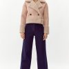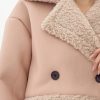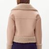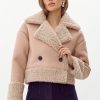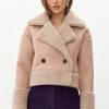 Pink leather coat with shearling details along the collar, bodice, and sleeves. The faux coat is built in a cropped structure and installed with a double-breasted closure.