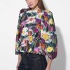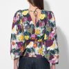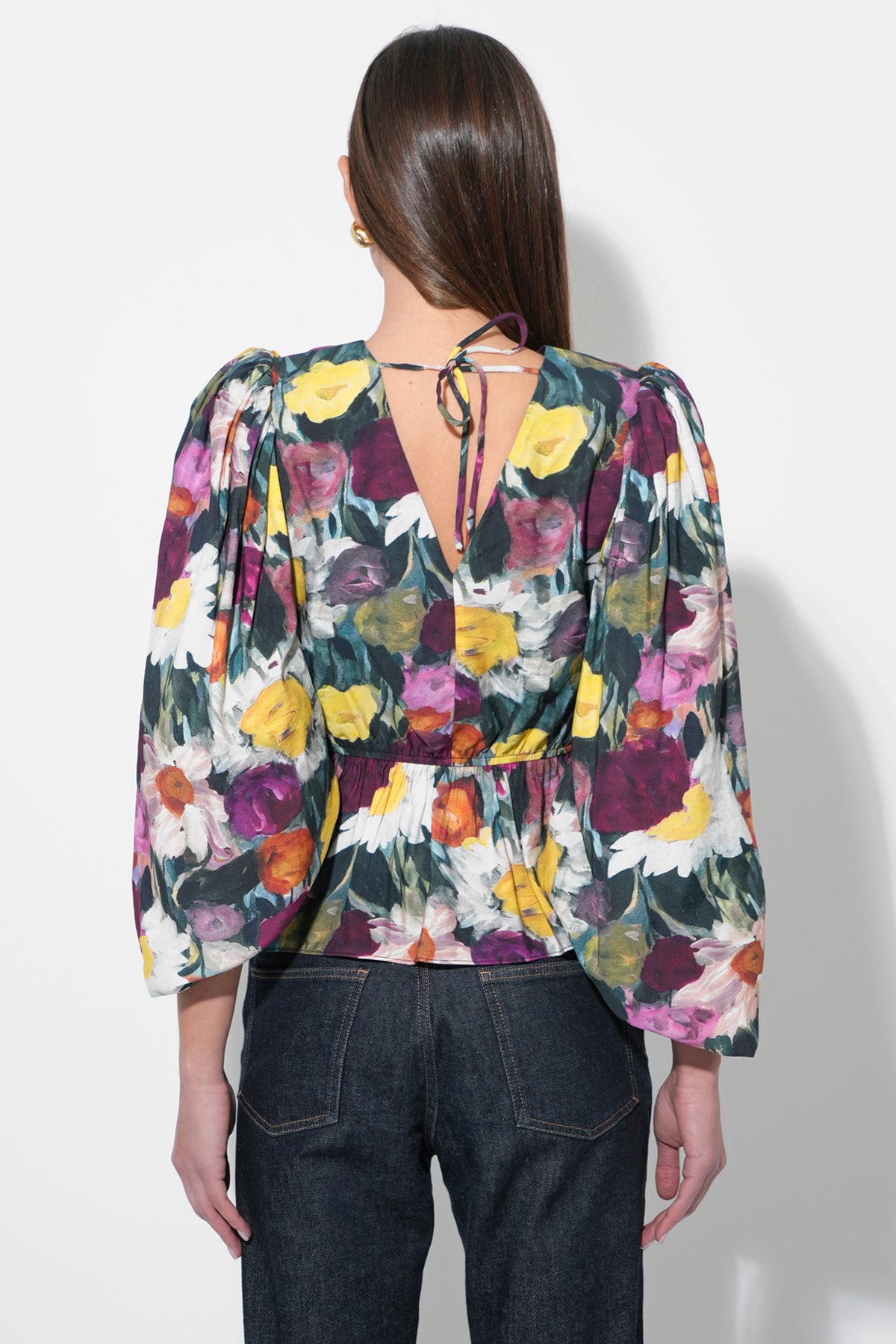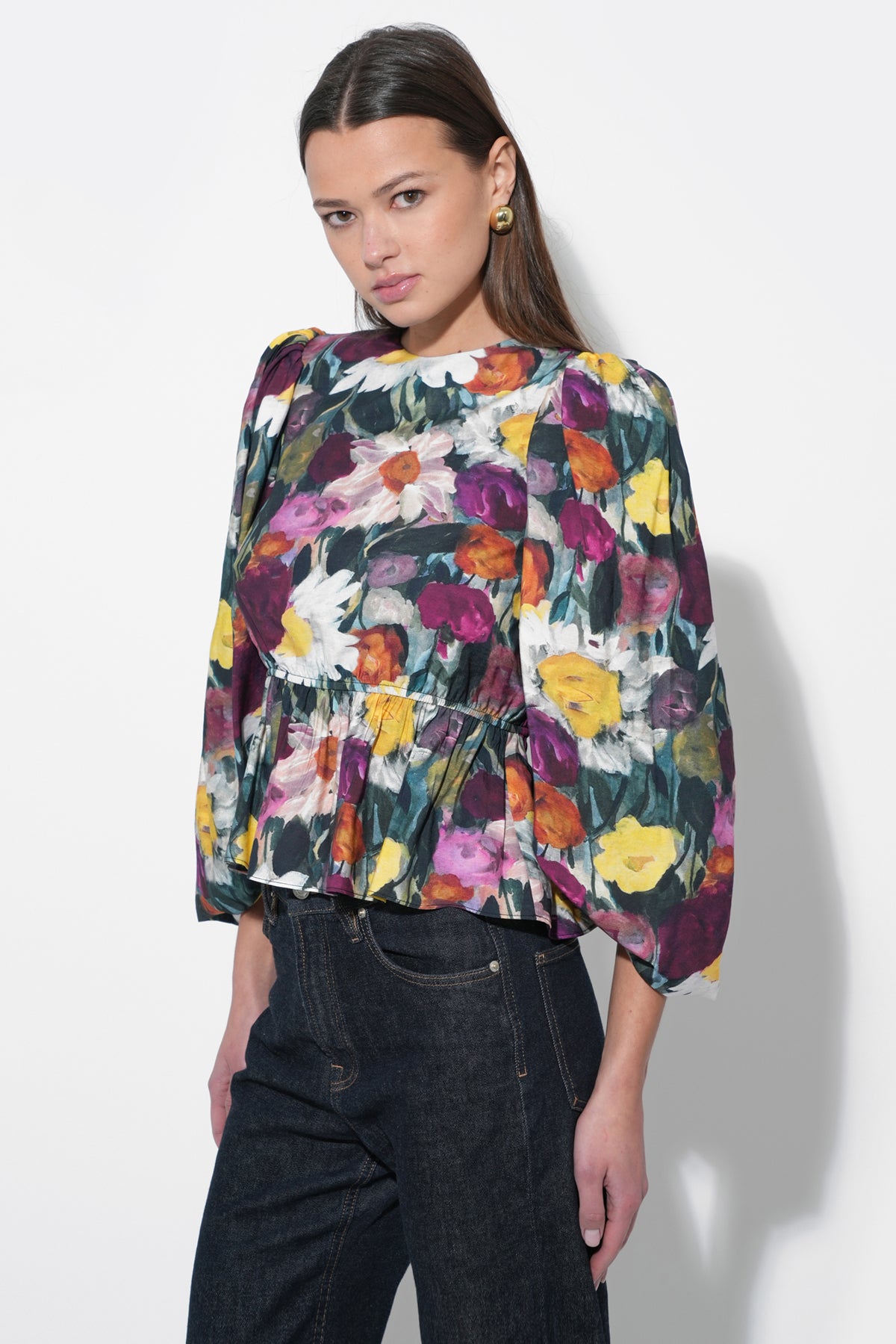 This vibrant blouse features a charming multi-color floral or abstract print on a dark background, creating a lively contrast. The design includes a flattering V-neckline with delicate ruffle details, long semi-sheer sleeves with elastic cuffs, and a defined peplum waist that creates a beautiful, feminine silhouette.