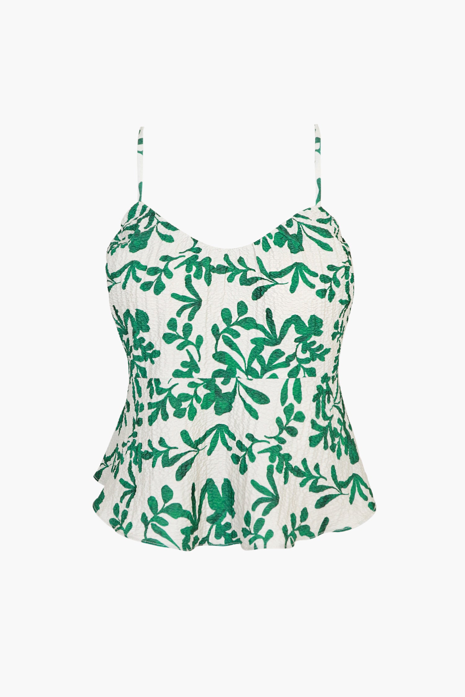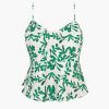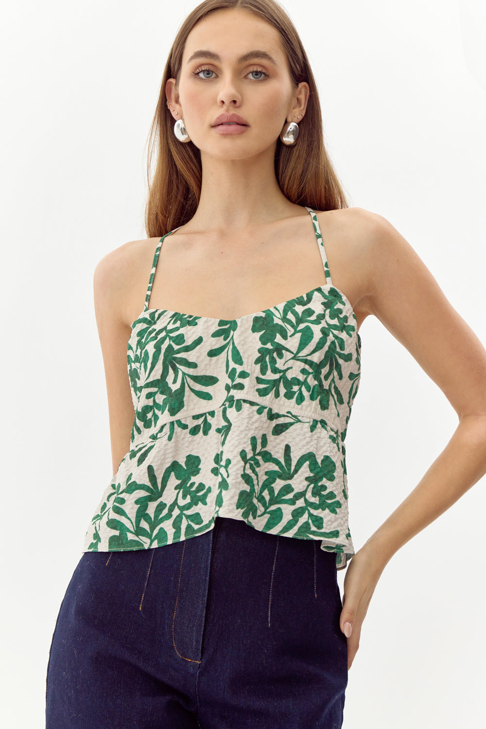 The camisole completely stands out in it’s green and cream pattern print. It’s installed with adjustable cross straps and a fit and flare silhouette.