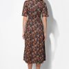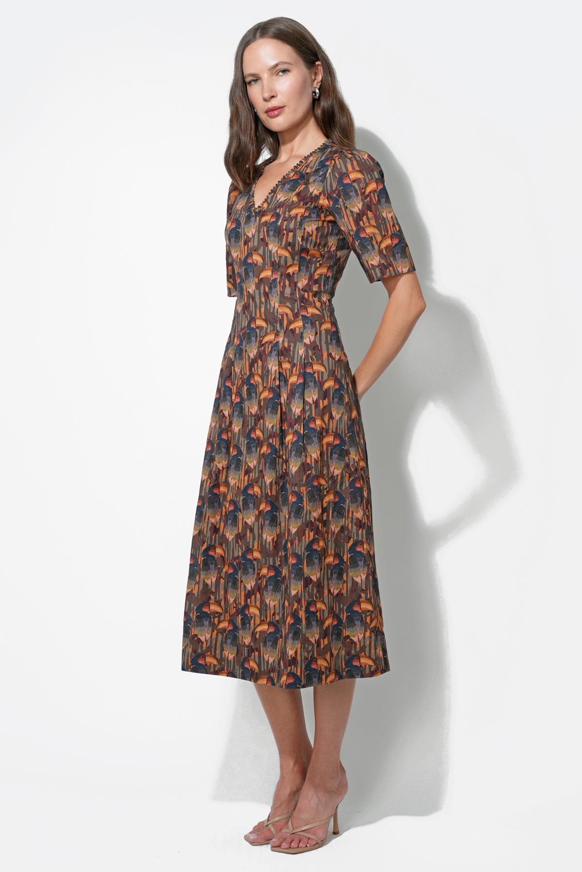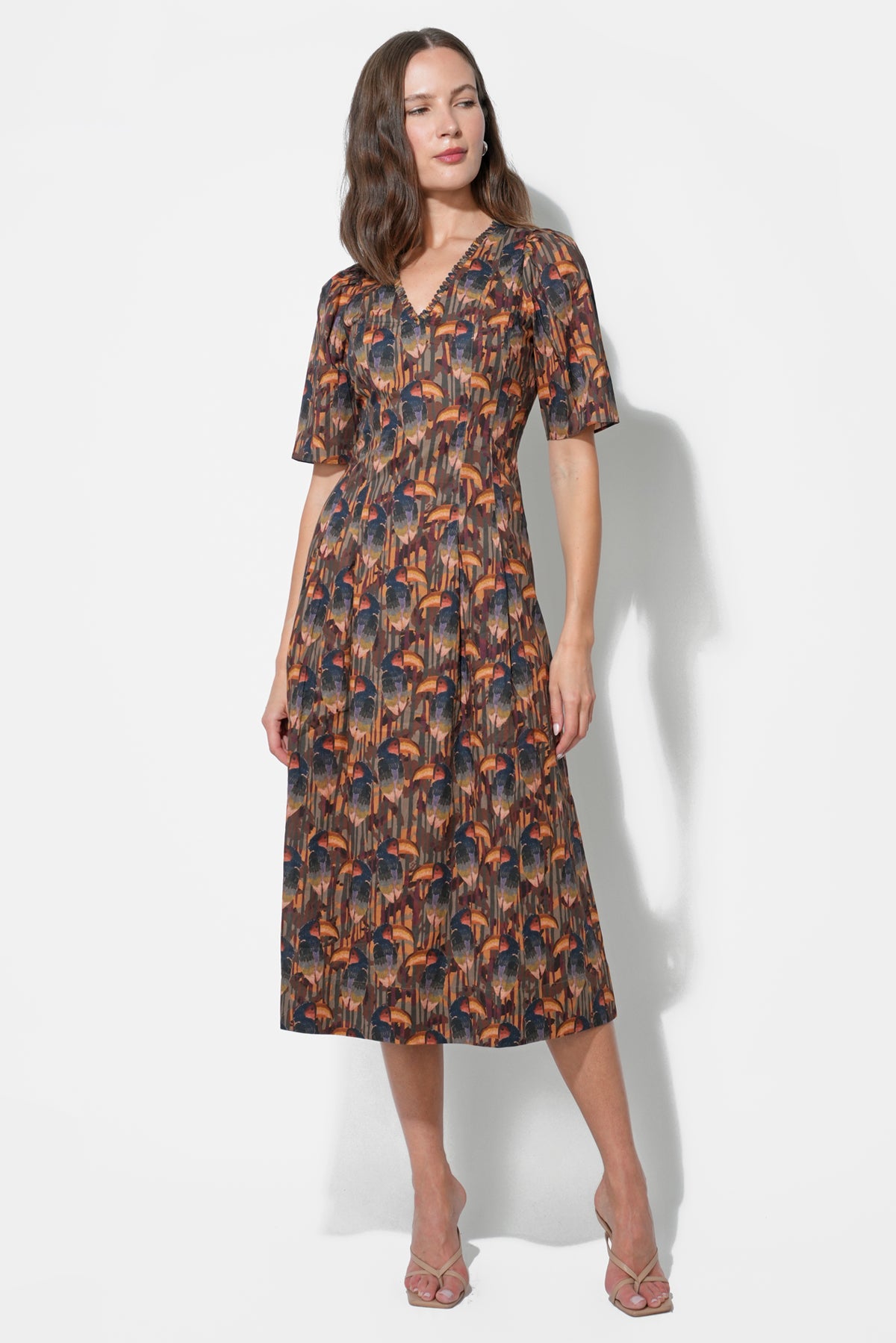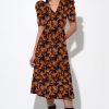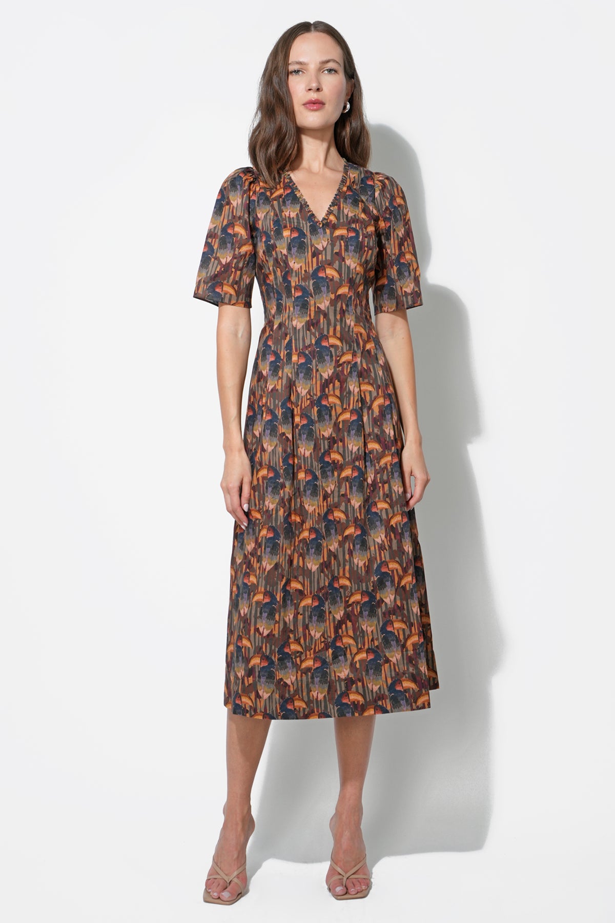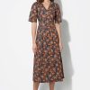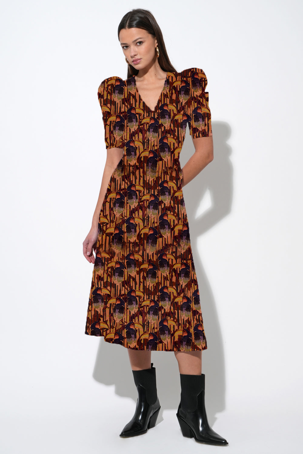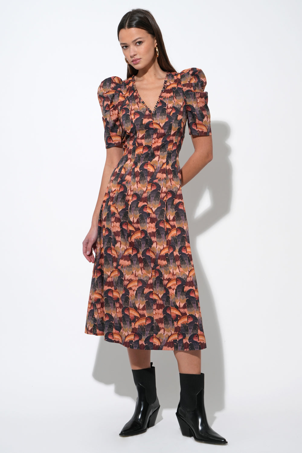 This stunning midi dress, in a captivating bright pink hue with a subtle textured finish, is designed to make a statement. It features a flattering V-neckline and romantic short puff sleeves, adding a touch of feminine elegance.