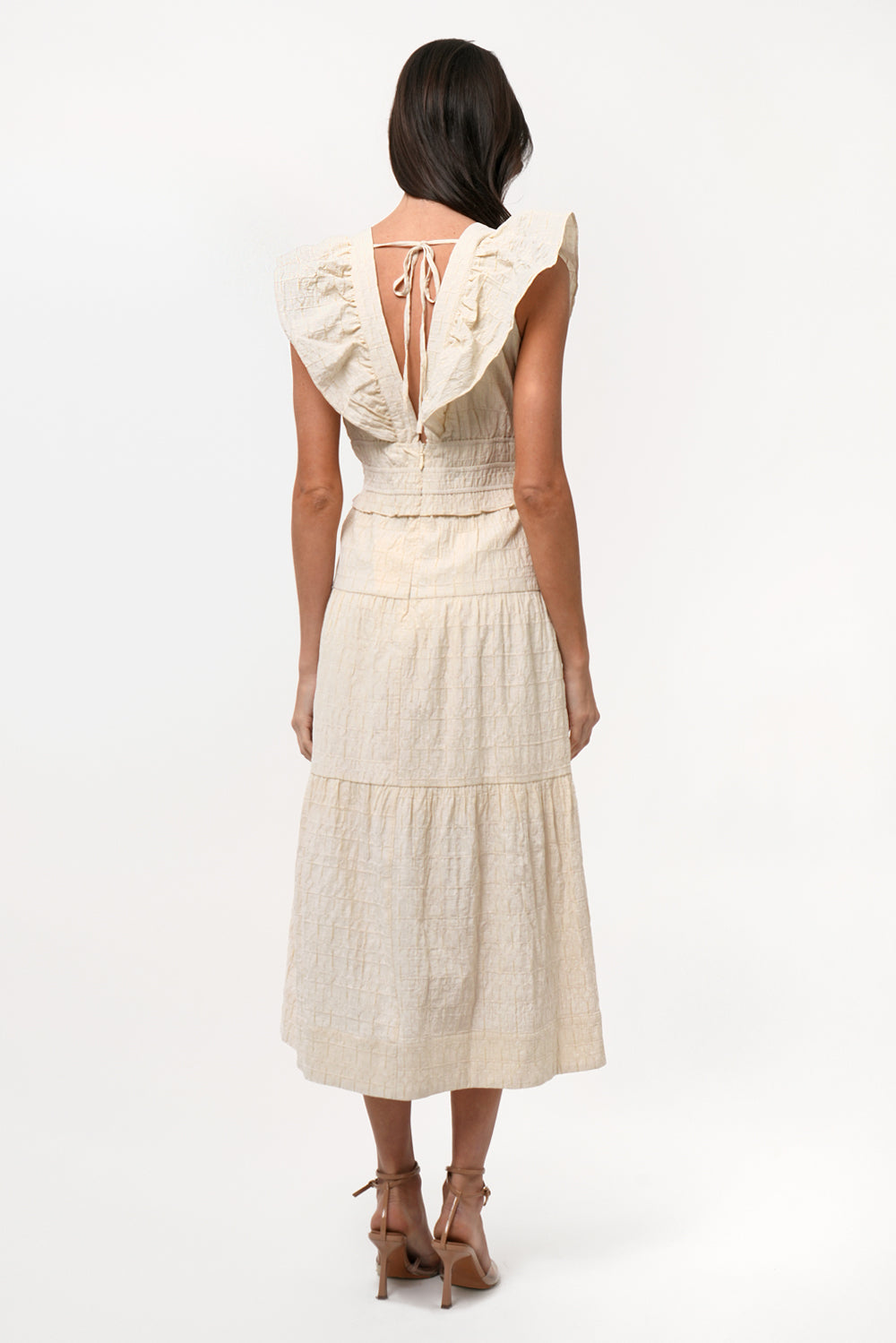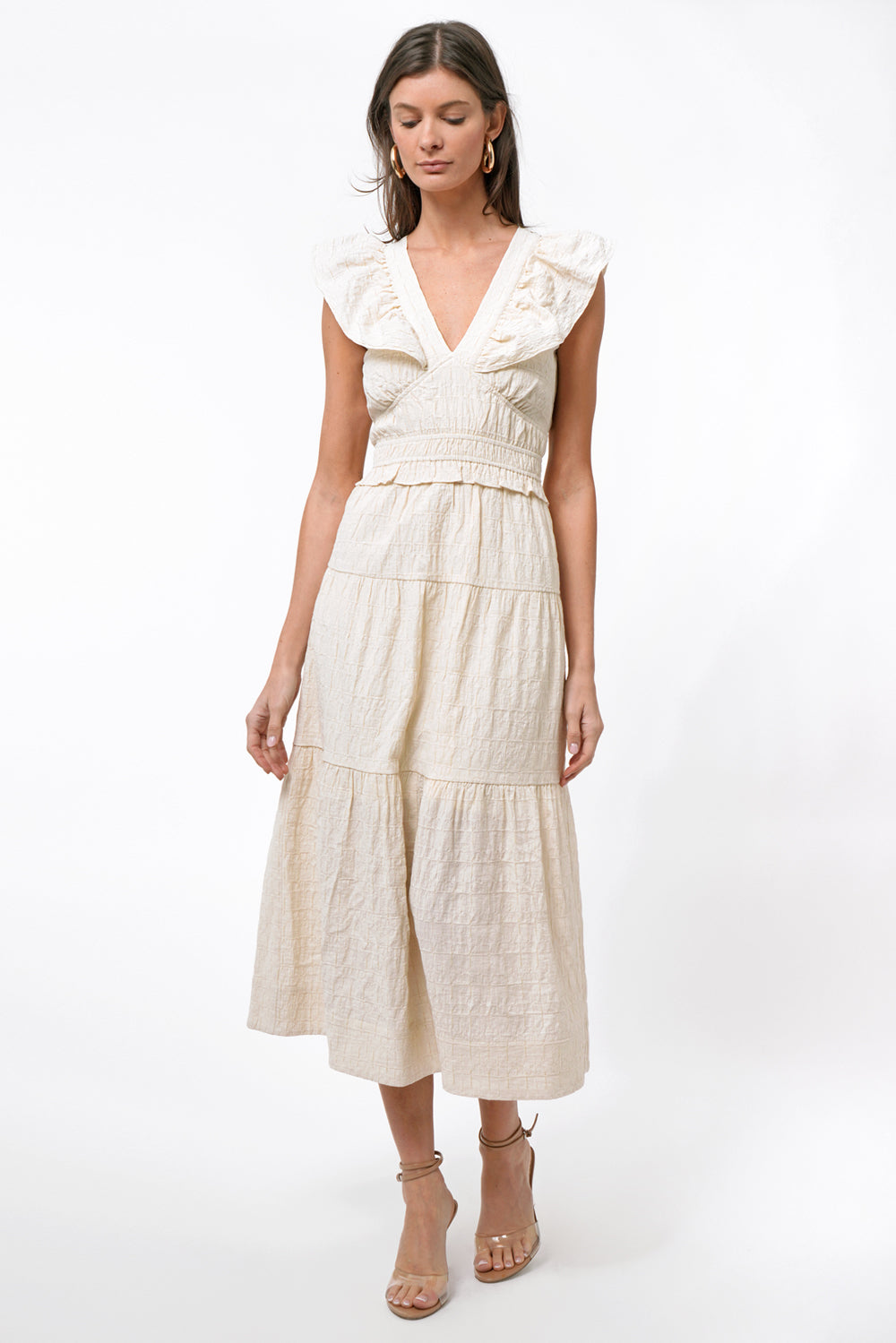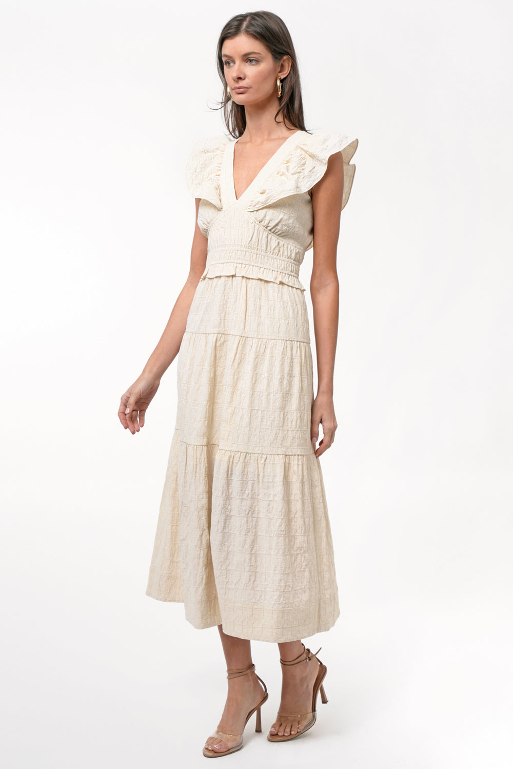 The Jina Midi Dress brings the drama with soft, romantic ruffle sleeves and a cinched waist that defines your shape just right. The crinkled fabric adds a bit of edge to the sweetness, making it the kind of piece you’ll reach for when you want to look like you tried (but didn’t).