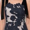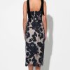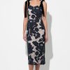 It features a nude-colored base fabric that is overlaid with a sheer navy mesh and adorned with a large, intricate, floral embroidery pattern in navy. The dress has a flattering midi length and a pencil-style silhouette that is fitted through the waist and hips.