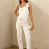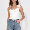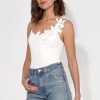 Designed with a sleek asymmetrical neckline, this bodysuit features delicate 3D floral appliqués cascading across one shoulder, adding an elegant, sculptural touch. Crafted in a smooth, figure-hugging fabric, it provides a seamless and flattering fit, perfect for tucking into tailored trousers, high-waisted denim, or flowy skirts.
