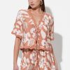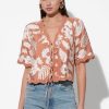 This charming top features a warm, earthy tone adorned with an elegant floral and botanical print in white and subtle pops of purple. The relaxed silhouette is enhanced by wide, flowy sleeves and a distinctive scalloped trim along the V-neckline and hem. Playful mini front ties add a touch of adjustable style, allowing for a personalized fit.