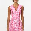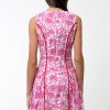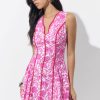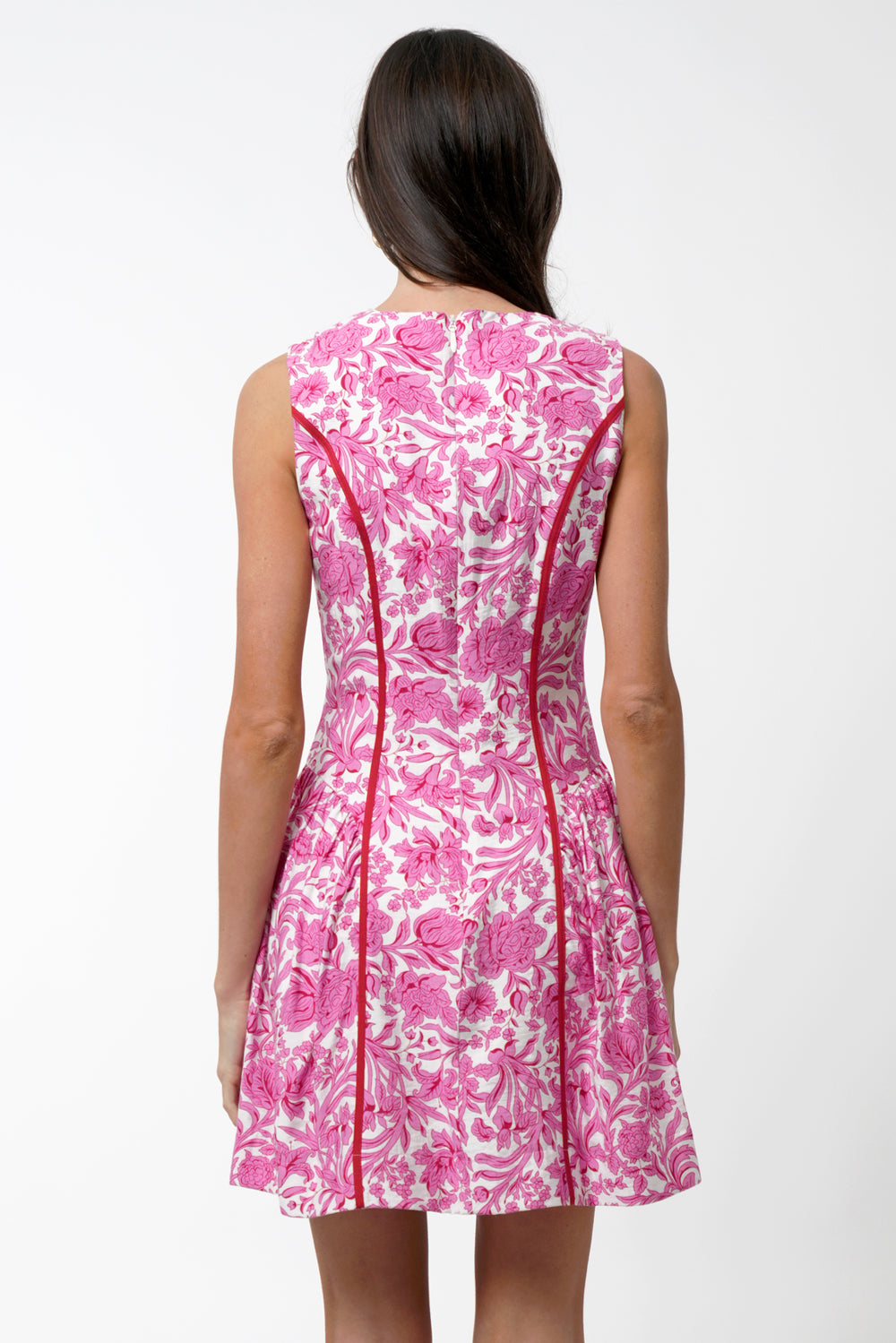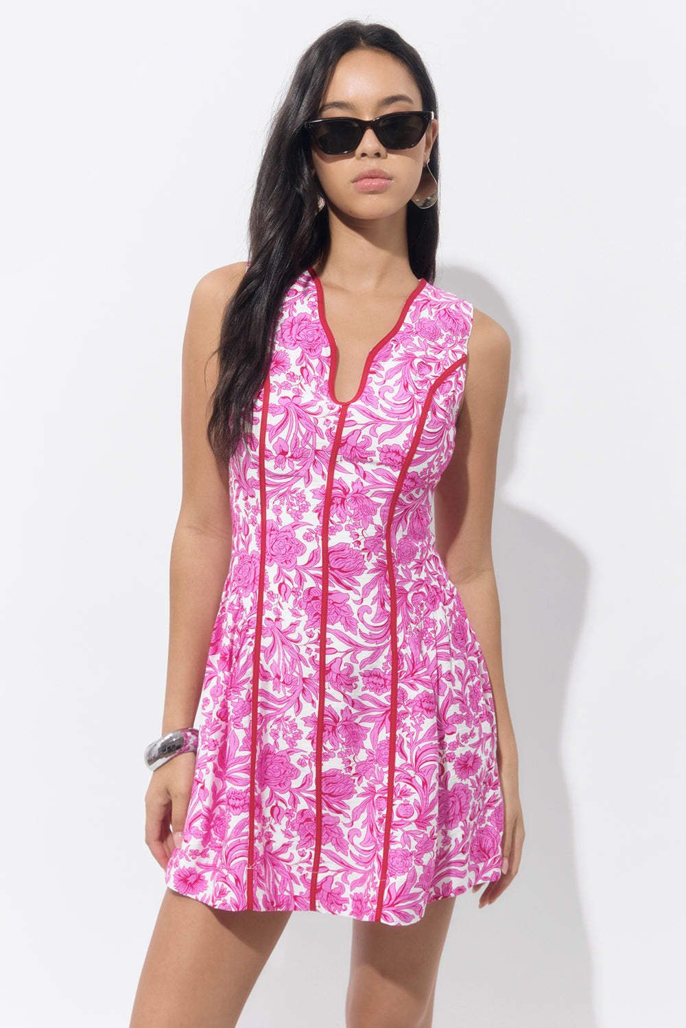 This sleeveless A-line silhouette pops in a vibrant pink floral print, accented with bold contrast piping that defines your shape and adds the sweetest touch of structure. The scalloped split neckline brings a playful twist, while the pleated skirt gives it that easy, twirl-worthy movement we live for.