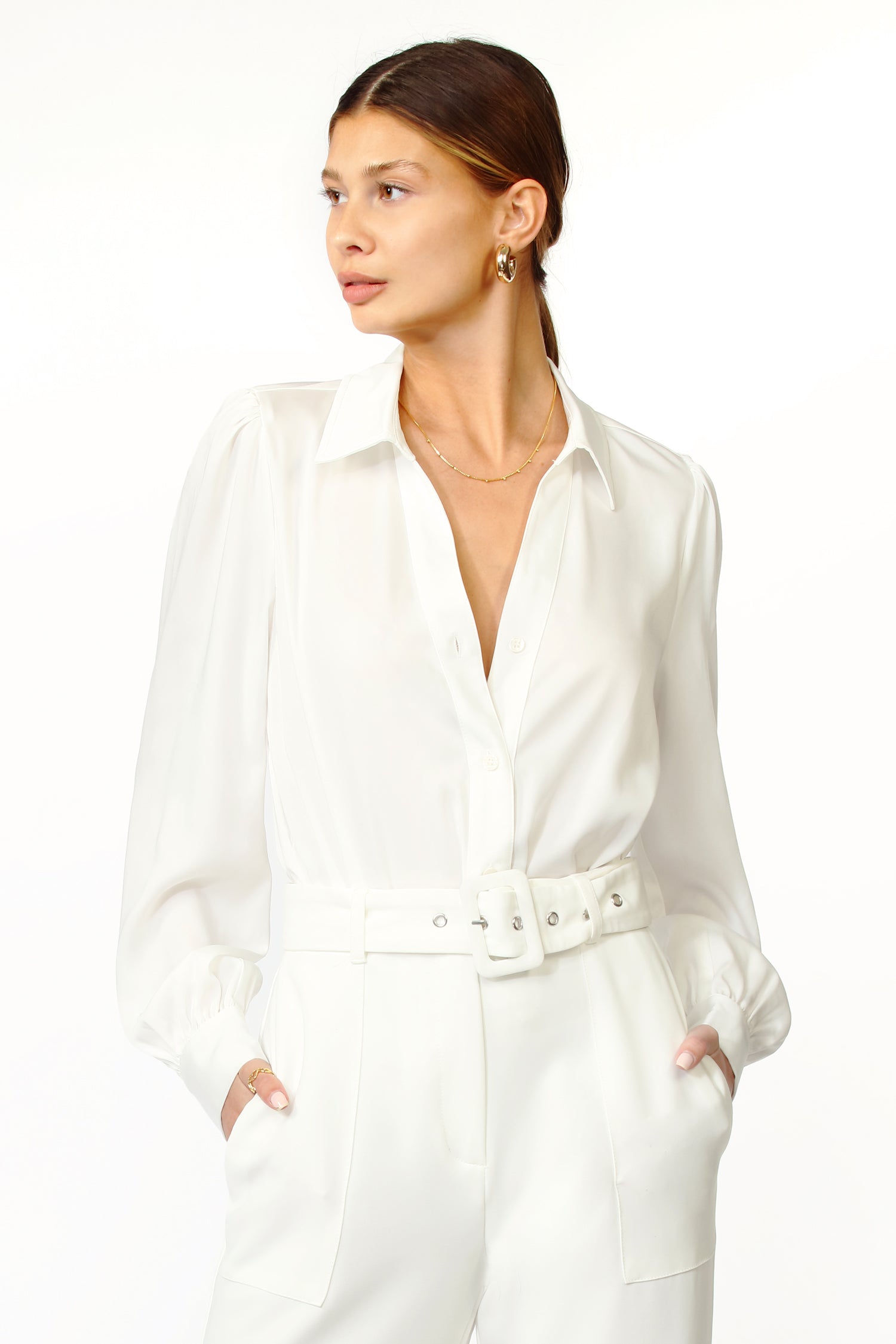 Tucking in the button-up shirt isn’t always enough, especially one made up of a sateen material. To prevent loose ends, the Kiara Bodysuit was designed. It’s soft and silk-like material is comfortable and retucking-proof.