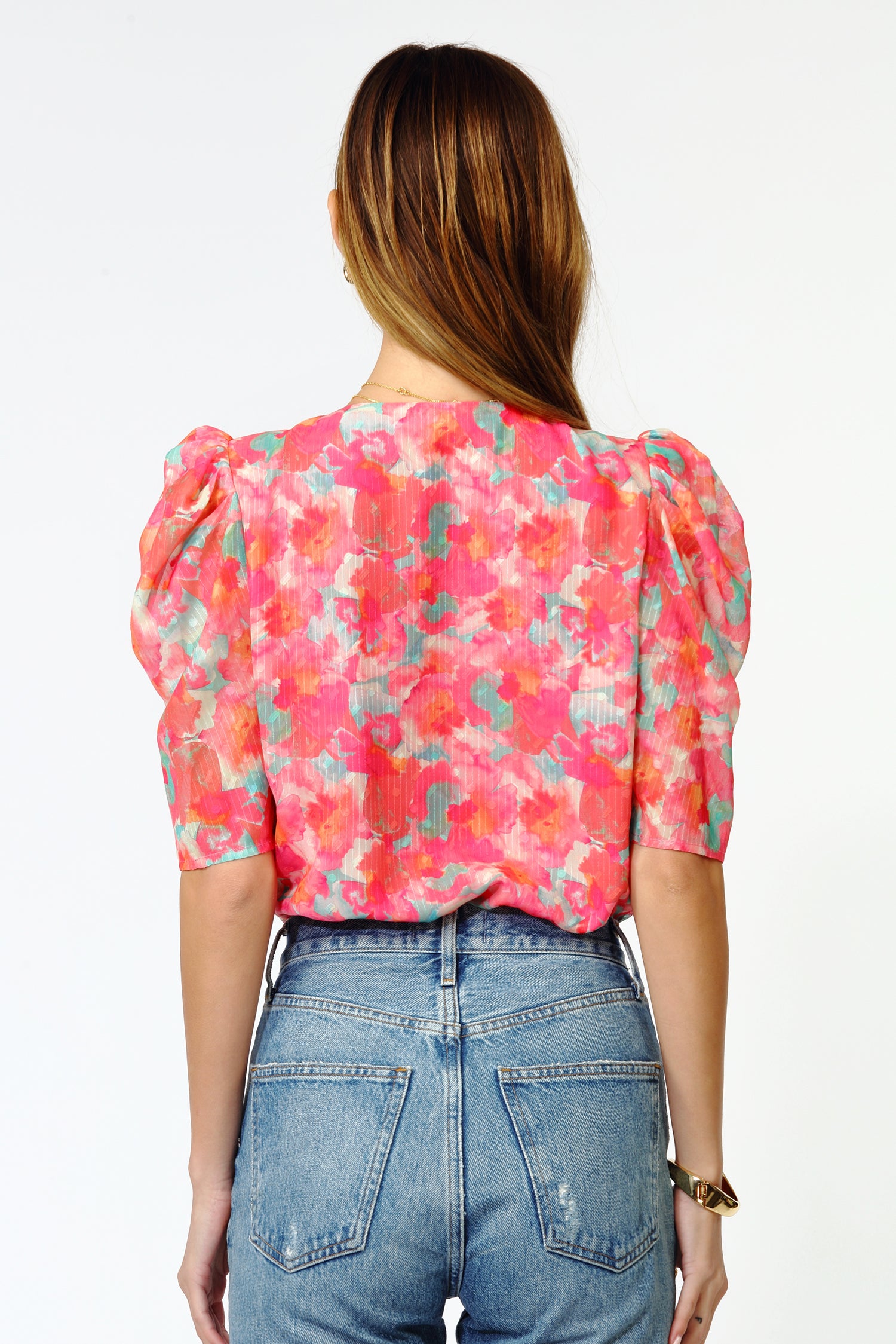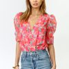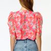 A faux wrap shirt design and ruche short-sleeves cut from a mixed-color material. Puffed sleeves for a bold shape along with a flattering V-neckline.