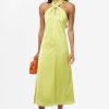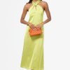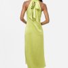 Cue the drama. The Kristine Back Bow Satin Midi Dress is sleek, stunning, and seriously statement-making. Designed in a juicy chartreuse satin with a subtle textured finish, this dress features a twisted halter neckline with a peekaboo front cutout and an oversized bow that ties in back for a dramatic exit moment.