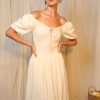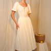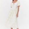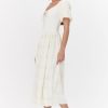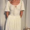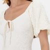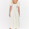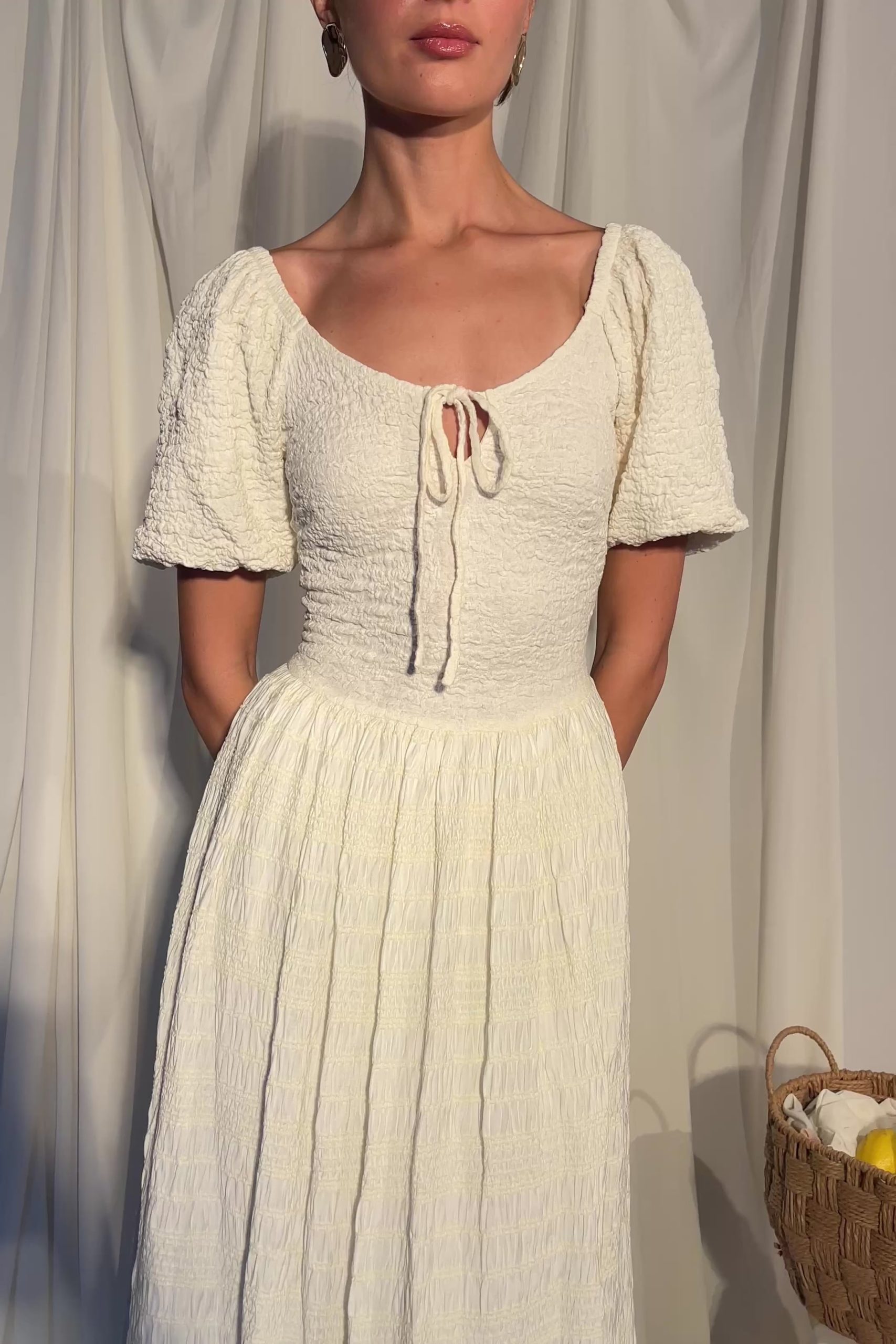 Popcorn-textured, mid dress featuring balloon sleeves and a tied neckline. Showcasing a tightly-fitted bodice and flared skirt, the dress is complimented with a scoop neckline, which can be pulled down for an off-shoulder look.