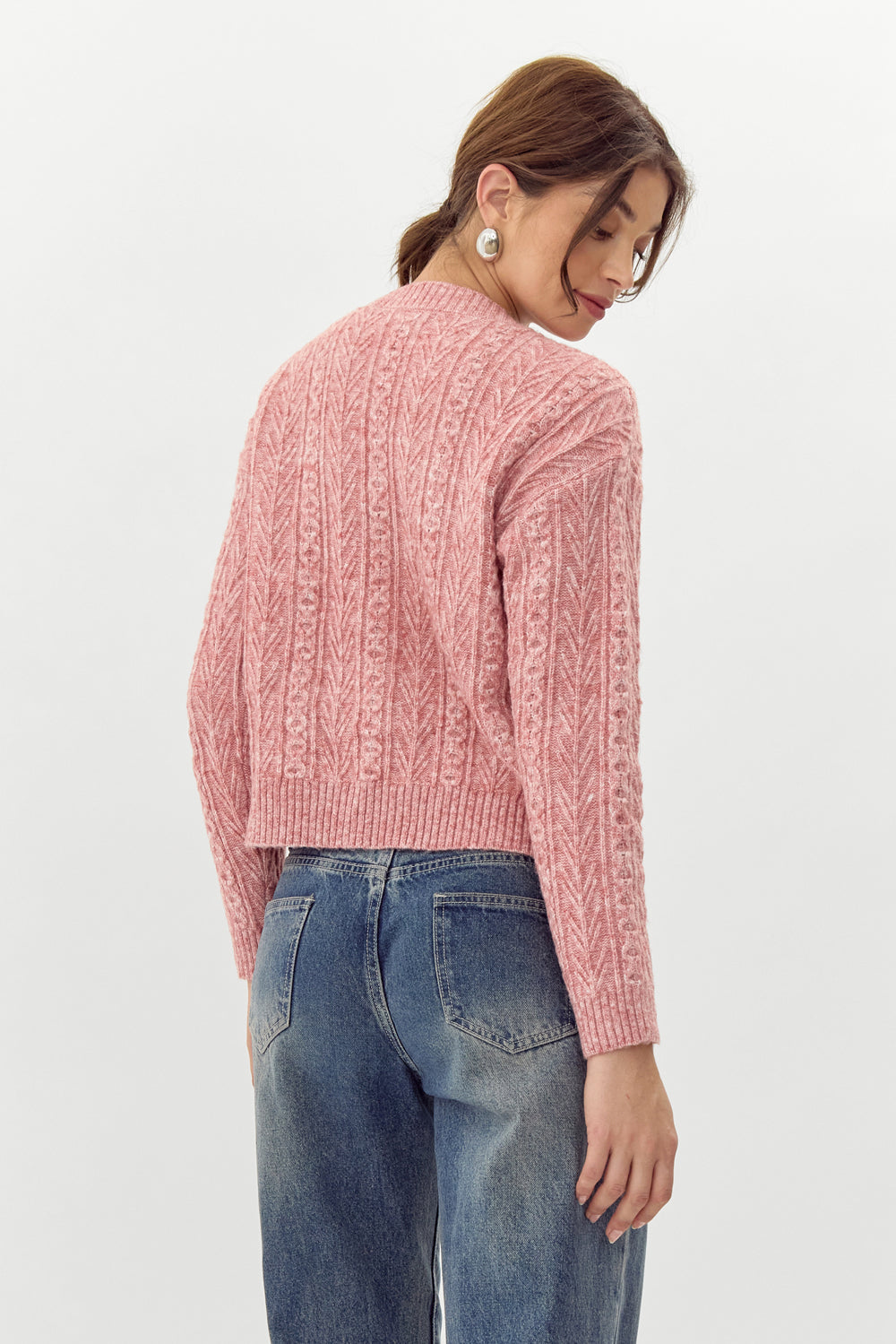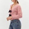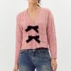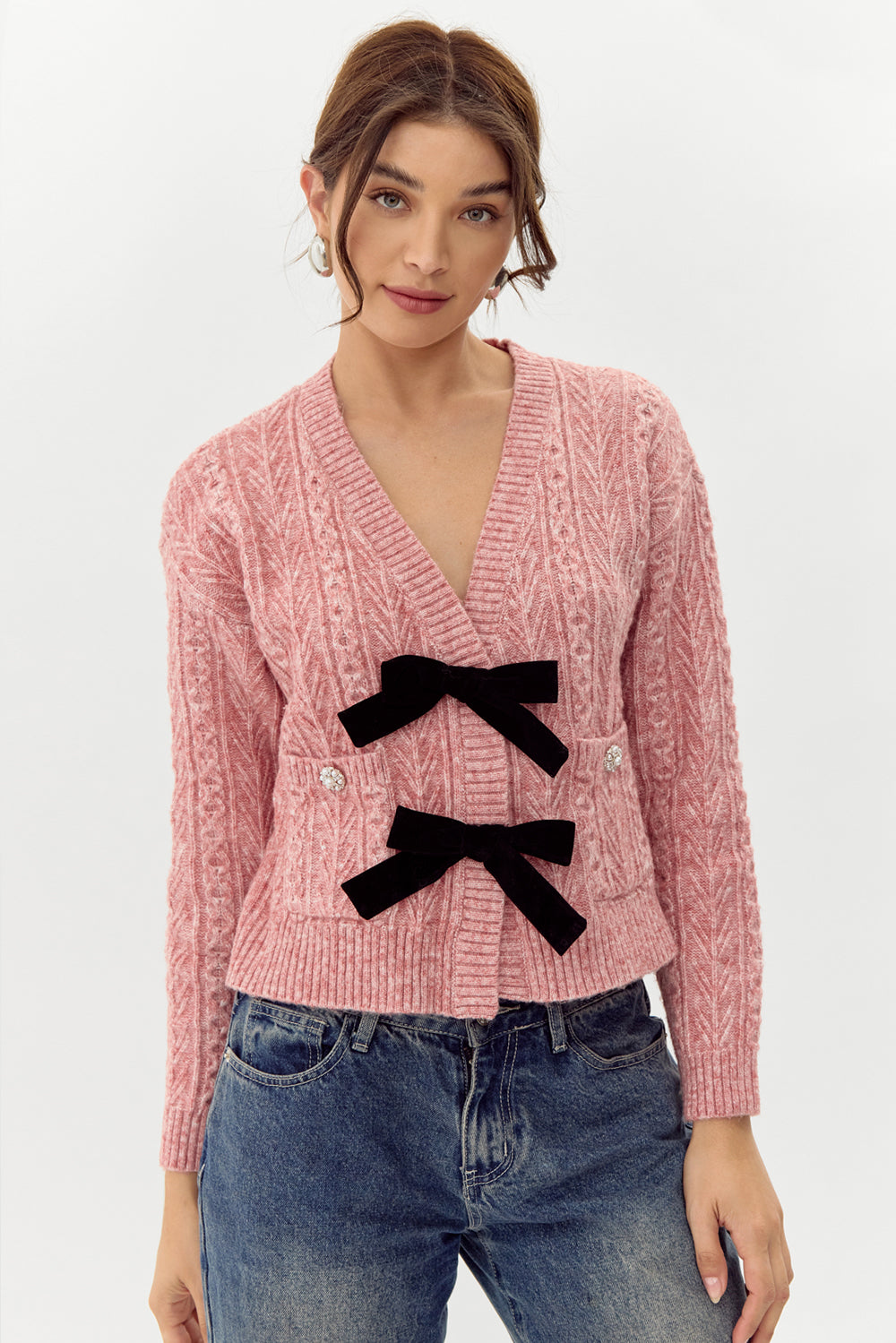 Add some feminine flare to your wardrobe in the Kendall Bow Front Jeweled Cardigan. It has a cable knit pattern throughout and features ribbon tie closures along the front opening. Wear it over a fitted top and pair it with a skirt and boots.