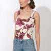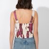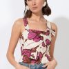 This floral crop top showcases a twisted bodice with pleated details. The adjustable straps are adorned with parallel stitching and the back is installed with a smocked panel.