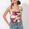 This floral crop top showcases a twisted bodice with pleated details. The adjustable straps are adorned with parallel stitching and the back is installed with a smocked panel.