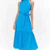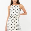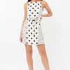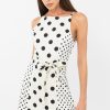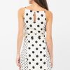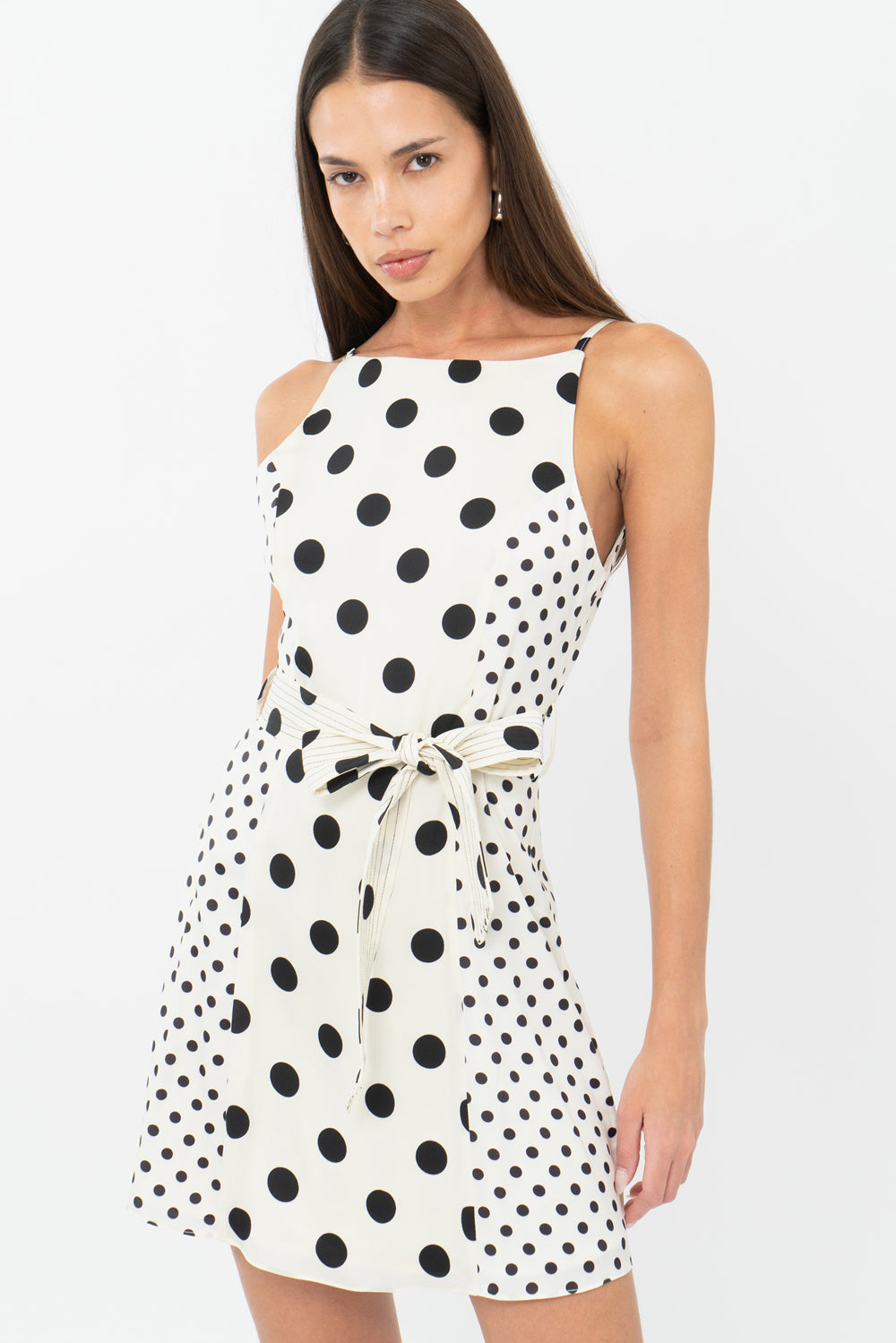 Sleeveless mini dress featuring a tie waist belt. The polka dot pattern is contrasted with smaller dots on the sides. Finished with a keyhole button in the back.