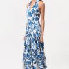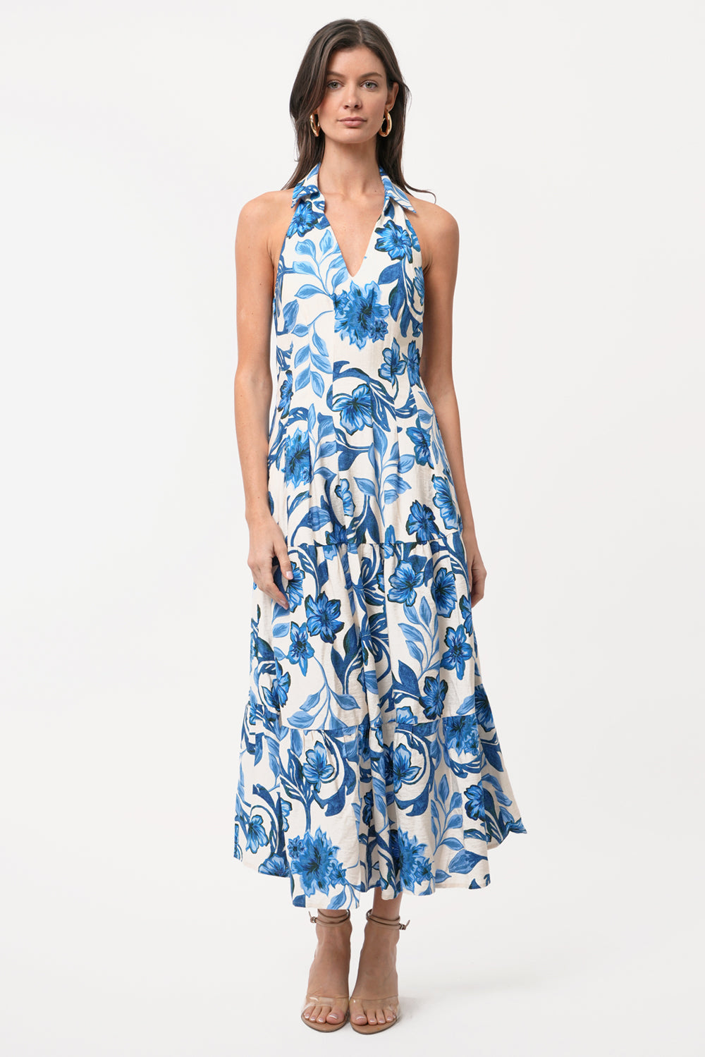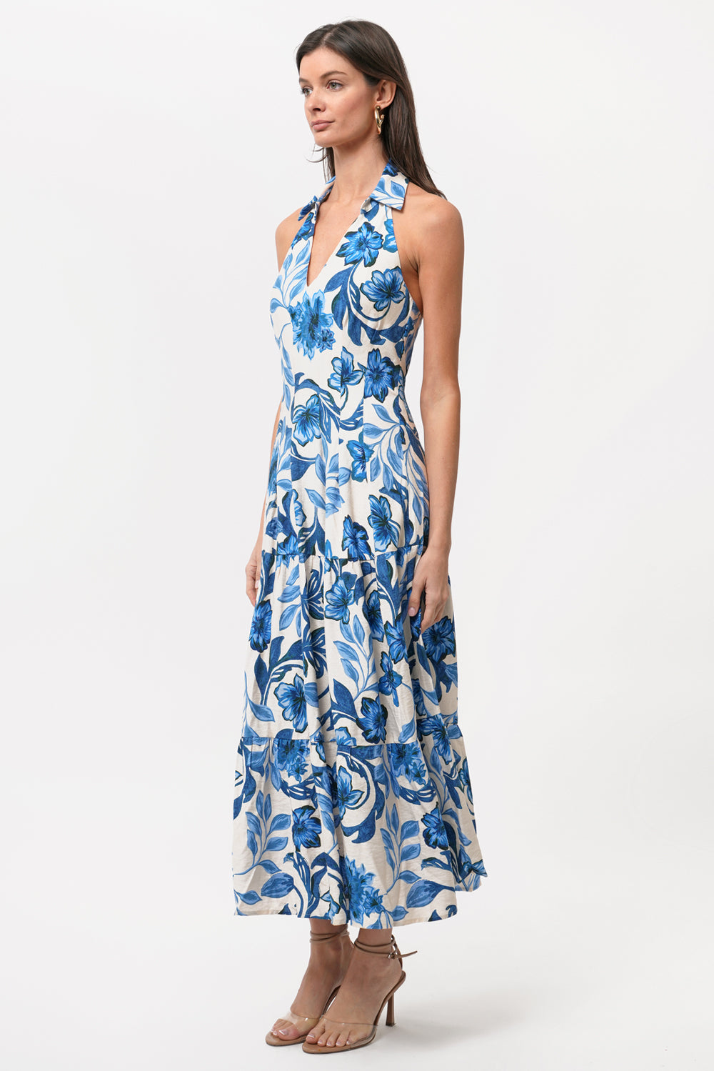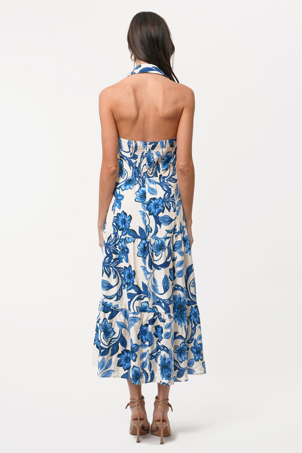 Romantic, refined, and ready for the spotlight. The Lenni Dress features a bold blue floral print on a crisp ivory base, cut in a breezy halter silhouette that sculpts the bodice and flows into a tiered midi skirt. The open back adds just the right touch of allure, balanced by a polished collar neckline and soft, breathable fabric.