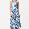Romantic, refined, and ready for the spotlight. The Lenni Dress features a bold blue floral print on a crisp ivory base, cut in a breezy halter silhouette that sculpts the bodice and flows into a tiered midi skirt. The open back adds just the right touch of allure, balanced by a polished collar neckline and soft, breathable fabric.