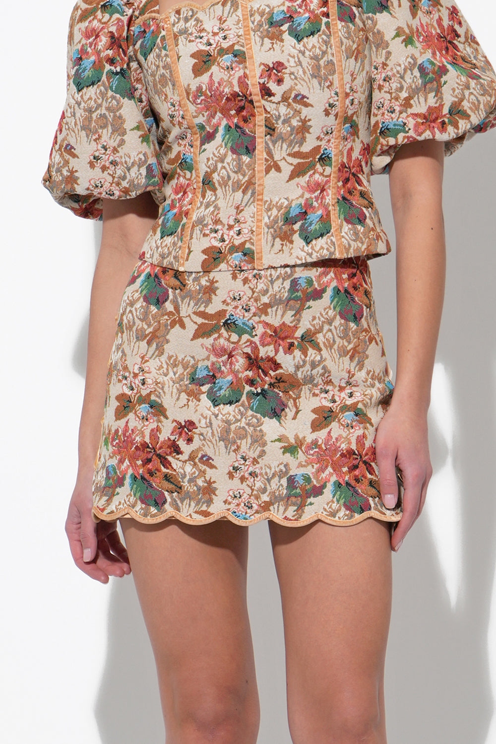 This captivating mini skirt showcases a rich, multi-colored tapestry-inspired print, blending hues of blue, orange, and cream for a unique and vibrant appeal. It features a stylish lace-up detail at the front, adding an edgy yet feminine touch, and is designed with a flattering fitted silhouette.