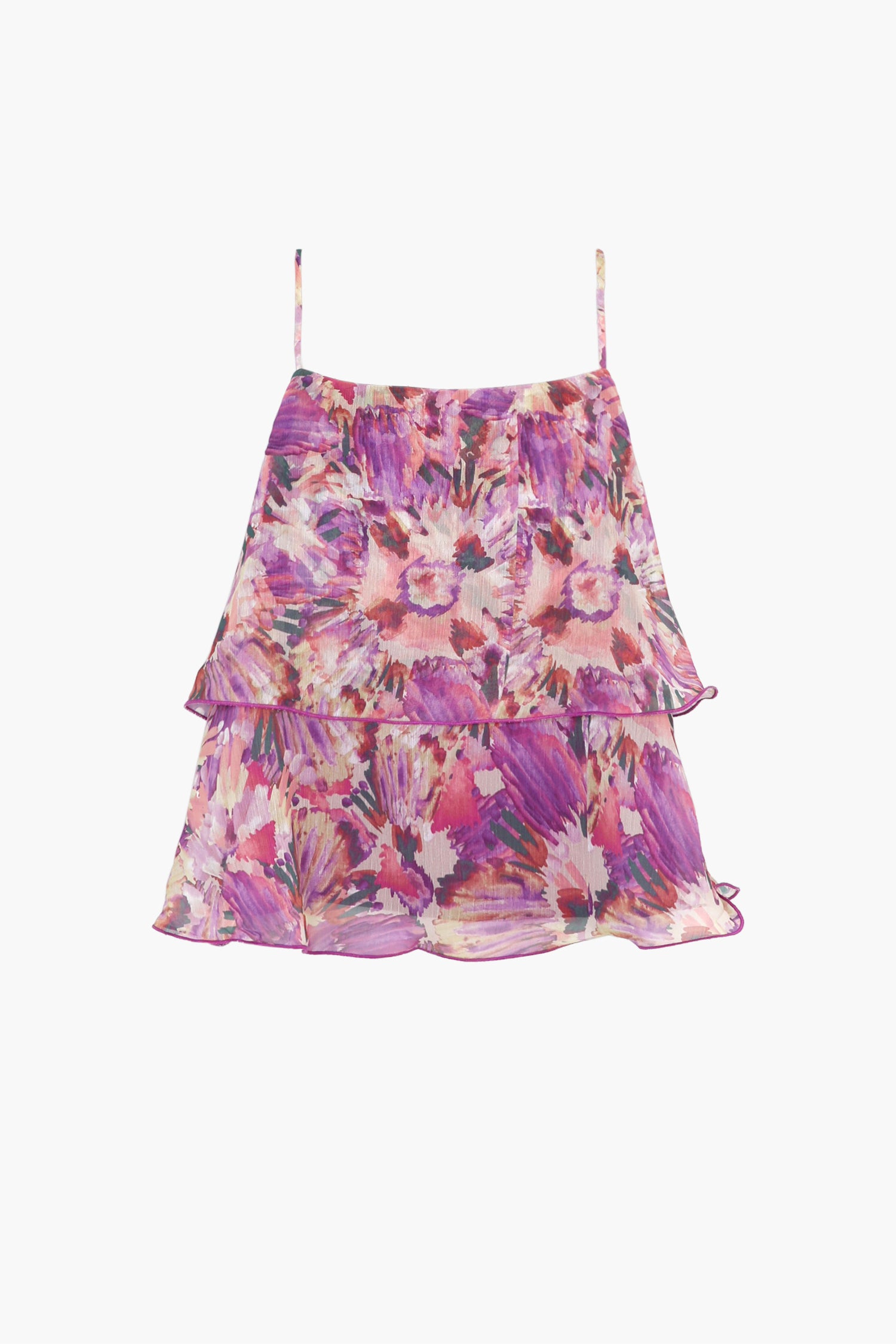 Cami top with tiered ruffles and a violet-yellow print. The style can be worn casually with jeans or toned up with a skirt and heels.