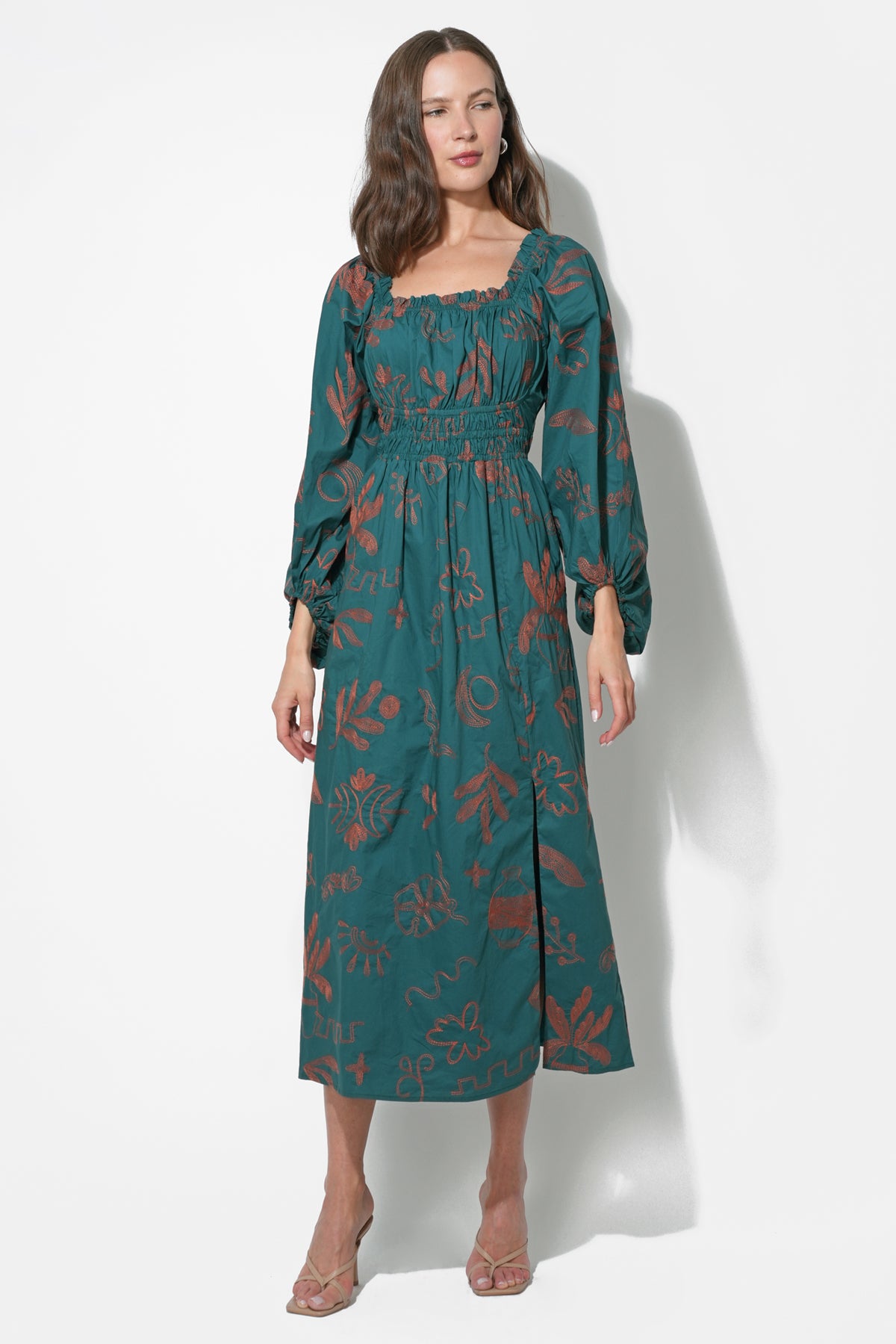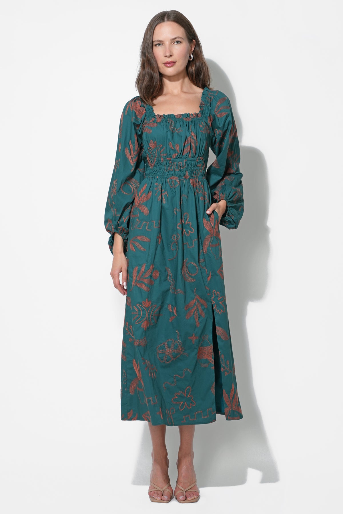 This delightful mini dress, in a beautiful light hue, is adorned with intricate embroidery, adding a touch of artisanal elegance. It features a flattering V-neckline with a delicate tie detail, allowing for adjustable styling, and romantic flutter sleeves that enhance its feminine appeal.