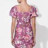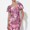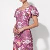 This captivating mini dress, in a vibrant magenta hue, is a perfect blend of feminine charm and modern elegance. It features a stunning floral lace overlay, a delicate sweetheart neckline, and charming puff sleeves. The dress’s tiered skirt, adorned with ruffled details, creates beautiful movement, while the fitted bodice ensures a flattering silhouette.