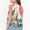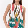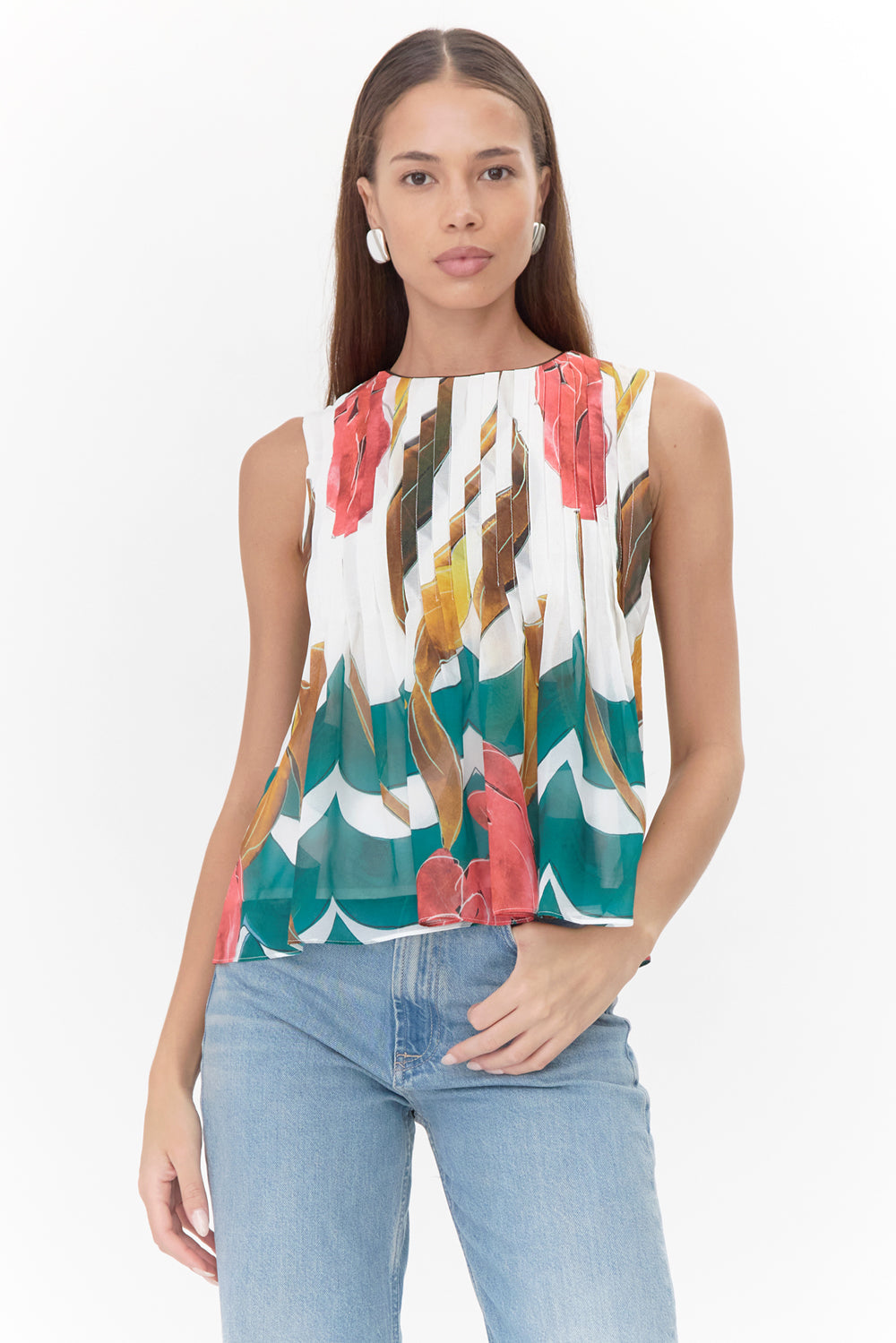 Sleeveless floral blouse featuring a scallop hem and a buttoned closure in the back. The fabric is pleated for extra texture. Style casually or elegantly.