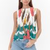 Sleeveless floral blouse featuring a scallop hem and a buttoned closure in the back. The fabric is pleated for extra texture. Style casually or elegantly.