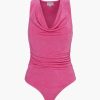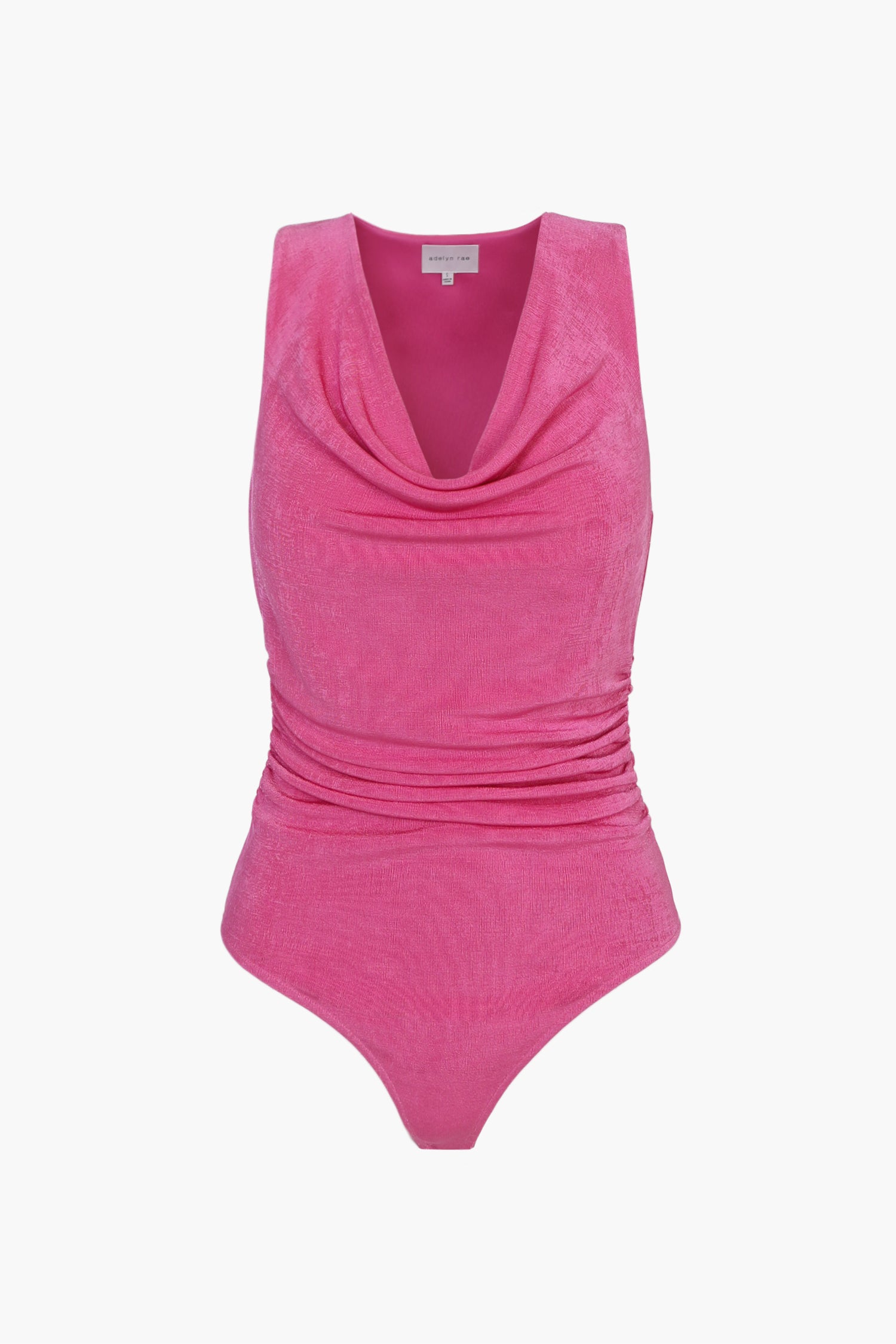Velvety bodysuit installed with a dramatic cowl neckline. The sides are taken in to give the body a draped texture.