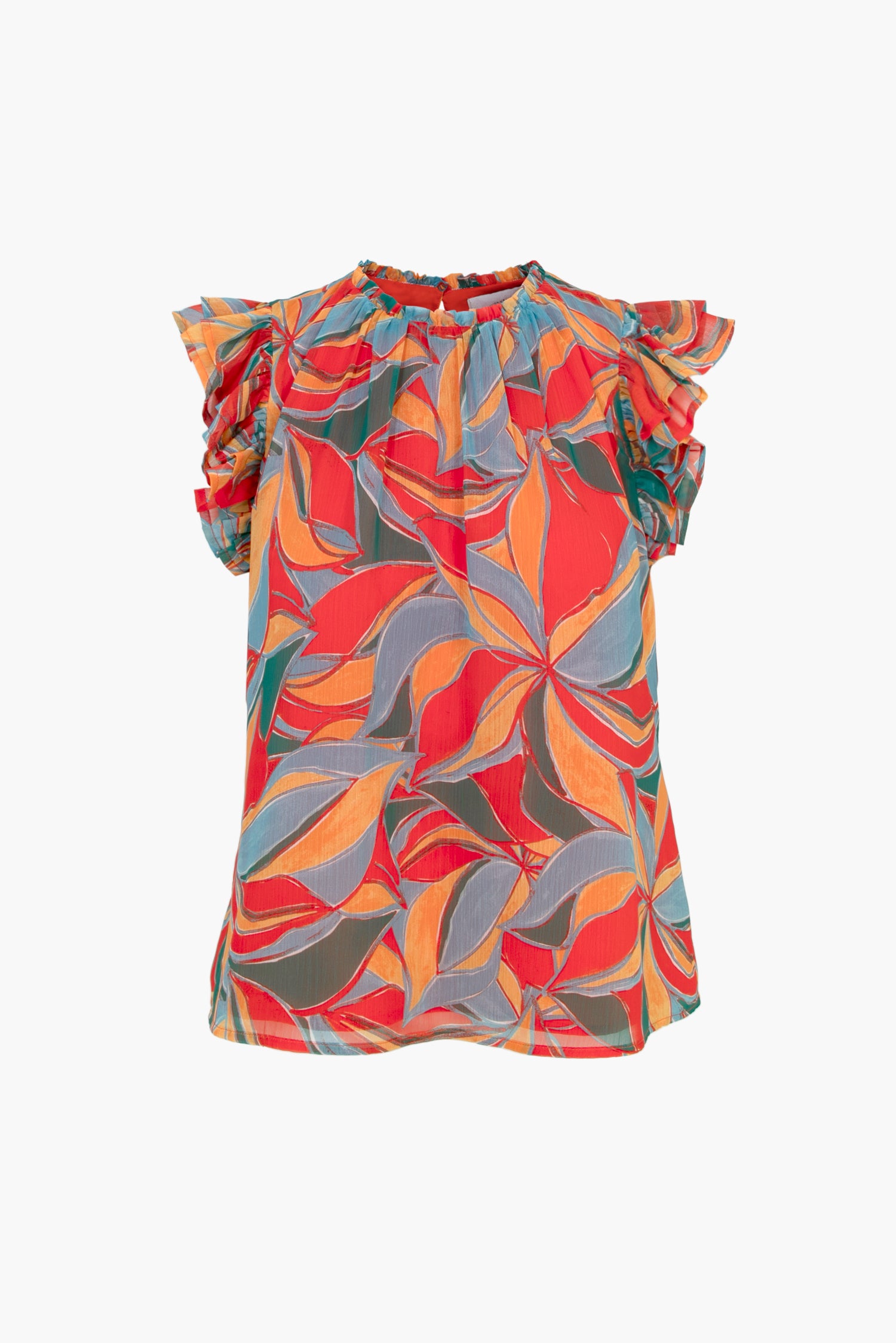 Blouse features a gathered collar and flouncy ruffle sleeves. Closed with a button on the back of the collar and finished off with a playful patterned textile. Versatile for daily wear or vacation attire.