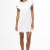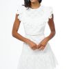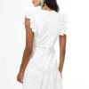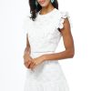 Sweet, structured, and ready for sunshine. The Lena Dress features a ruffled bib front, flutter sleeves, and an allover eyelet design with a scalloped hem. A fitted waist and flared mini skirt create a flattering shape that’s playful yet polished.