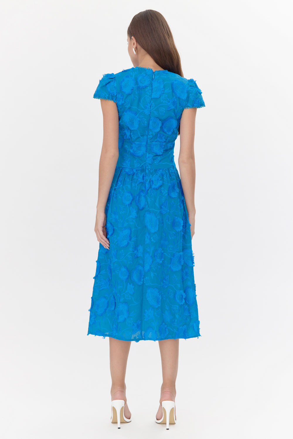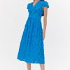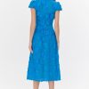 The “Nori Dress” falls to a midi length and is adorned by floral lace. In a vibrant blue shade, the silhouette is defined by cap sleeves, a V-neckline, and a wide waistband. It’s completed with a hidden back zipper and is fully lined.