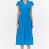 The “Nori Dress” falls to a midi length and is adorned by floral lace. In a vibrant blue shade, the silhouette is defined by cap sleeves, a V-neckline, and a wide waistband. It’s completed with a hidden back zipper and is fully lined.