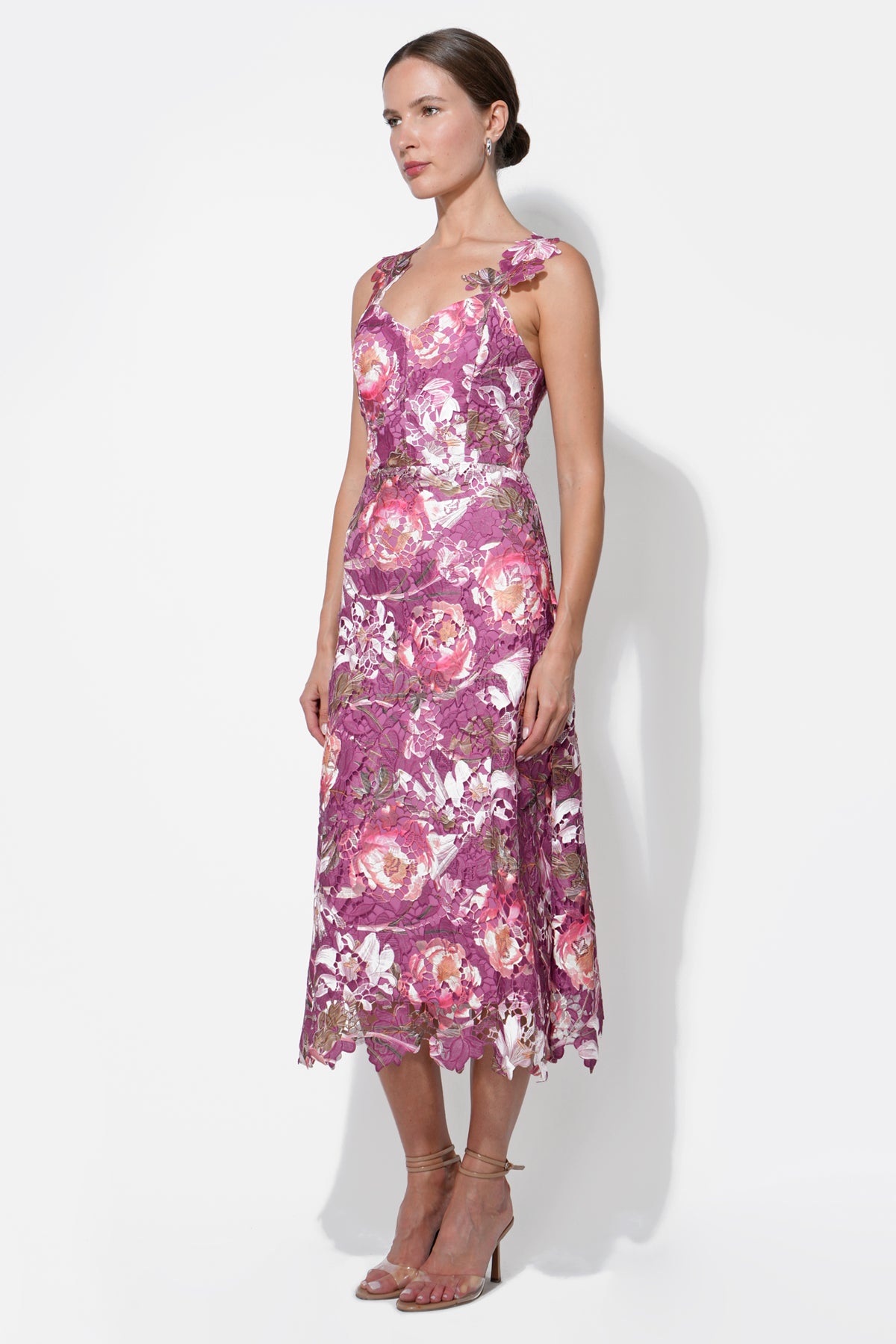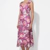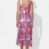 This enchanting midi dress, in a vibrant magenta hue, is a perfect choice for any special occasion. It features a beautiful all-over floral lace fabric, a flattering V-neckline, and long, sheer sleeves that add a touch of sophistication.