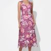 This enchanting midi dress, in a vibrant magenta hue, is a perfect choice for any special occasion. It features a beautiful all-over floral lace fabric, a flattering V-neckline, and long, sheer sleeves that add a touch of sophistication.